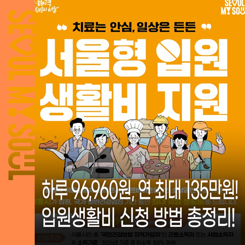 🔎 누려봐요 복지 건강 유급휴가가 없는 취약노동자도 안심하고 치료받을 수 있는 서울시 ‘입원생활비 지원’, 알고 계셨나요? ‘서울형 입원생활비 지원’ 제도의 지원 기준이 완화되고 지원 금액은 확대됩니다! 아파도 생계 걱정 때문에 병원을 미루고 계셨나요? 유급휴가가 없는 취약노동자도 안심하고 치료받을 수 있도록 서울시가 ‘입원생활비 지원’으로 도와드려요. 서울형 입원생활비 지원은 어...