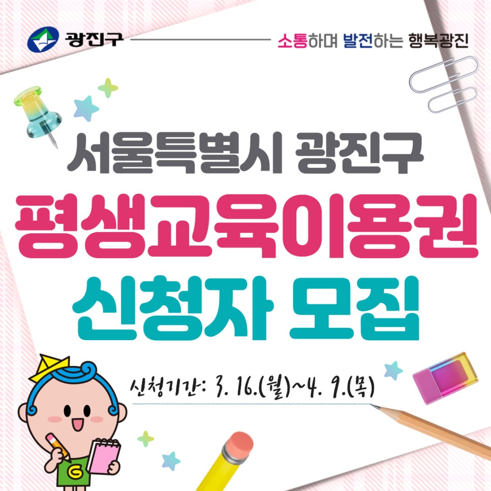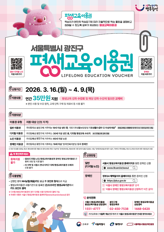 평생교육이용권이 무엇인가요? 학습자가 원하는 분야를 자율적으로 학습하고 참여할 수 있도록 정부가 제공하는 평생교육이용권(바우처)입니다. 광진구는 구민의 평생학습 참여 기회를 확대하고 학습격차를 완화하기 위해 서울시 평생교육이용권 지원으로 다양한 학습 활동을 뒷받침하고자 합니다. 관심있으신 분들의 신청을 부탁드립니다. 대상: 이용권 신청일 기준 주민등록상 광진구 거주자 중 아래 대상...
