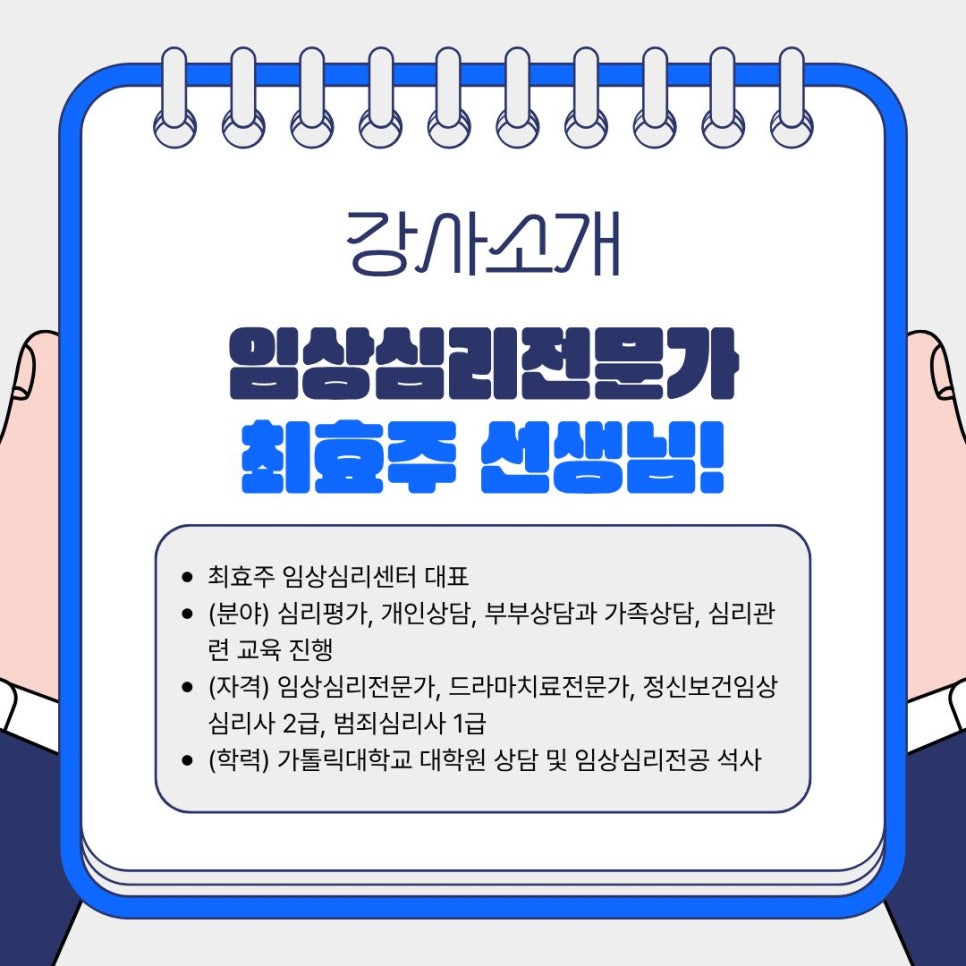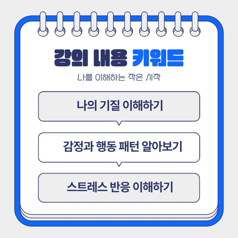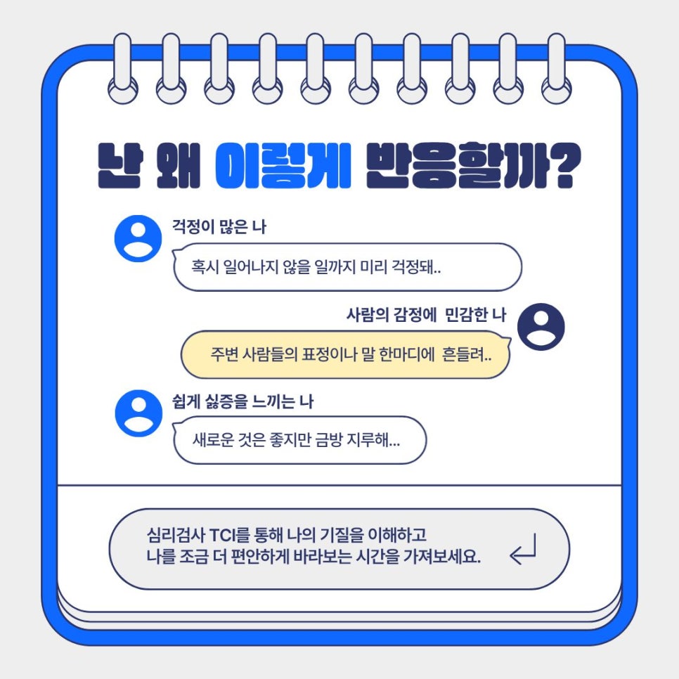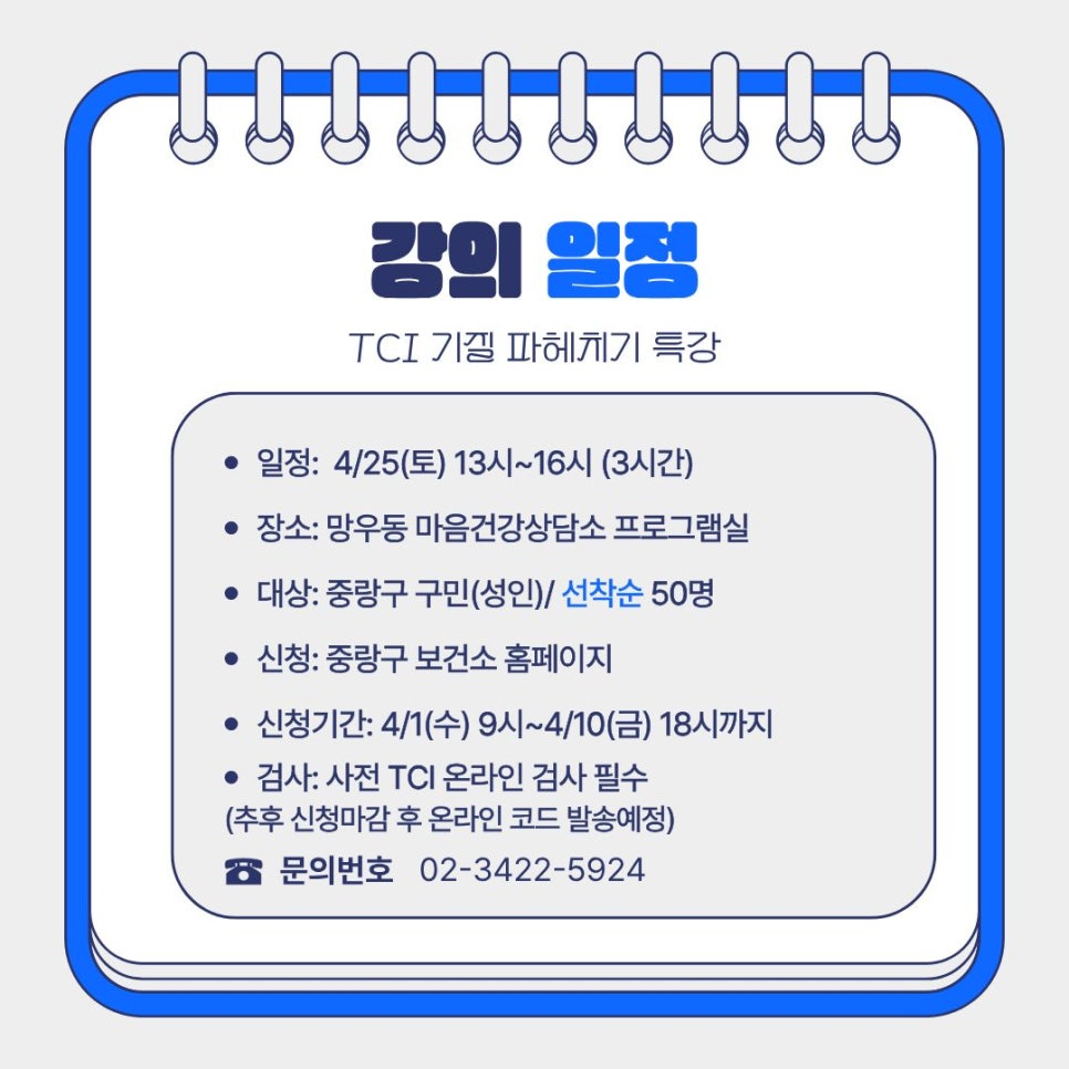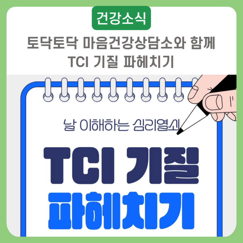 [건강소식] 토닥토닥 마음건강상담소와 함께 TCI 기질 파헤치기 문의 : 토닥토닥 마음건강상담소(☎ 02-3422-5924) 기질 및 성격검사(TCI)를 통해 개인의 타고난 기질의 특성과 심리적 반응 패턴을 이해함으로써 자신을 보다 깊이 탐색하고 일상 속 스트레스 대처와 관계 이해의 폭을 넓힐 수 있습니다. 이번 TCI 활용 전문가 특강은 4월 25일(토) 13:00 ~ 1...
