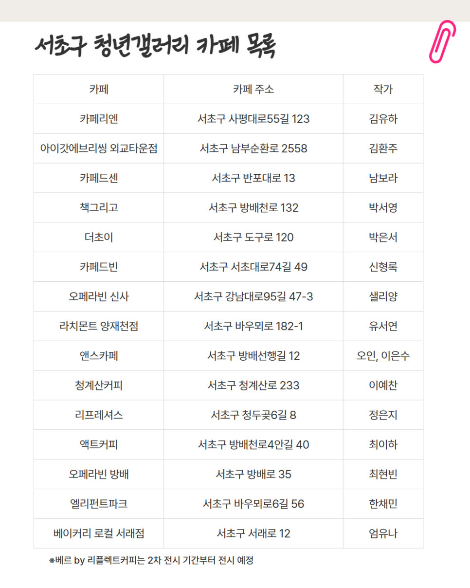 조용히 감성 채우고 싶다면 여기👇 서초구 청년 갤러리 카페로 어서옵초! 청년 작가들의 작품을 커피 한 잔과 함께 즐길 수 있는 서초구 청년 갤러리 카페들, 지금부터 제대로 털어볼게요☕ Previous image Next image 잔잔한 음악, 은은한 조명, 맛있는 커피와 함께 벽마다 청년예술작가들의 작품이 걸려 있어서 그냥 앉아만 있어도 전시회 온 느낌 낭낭해요. Pr...