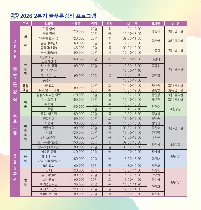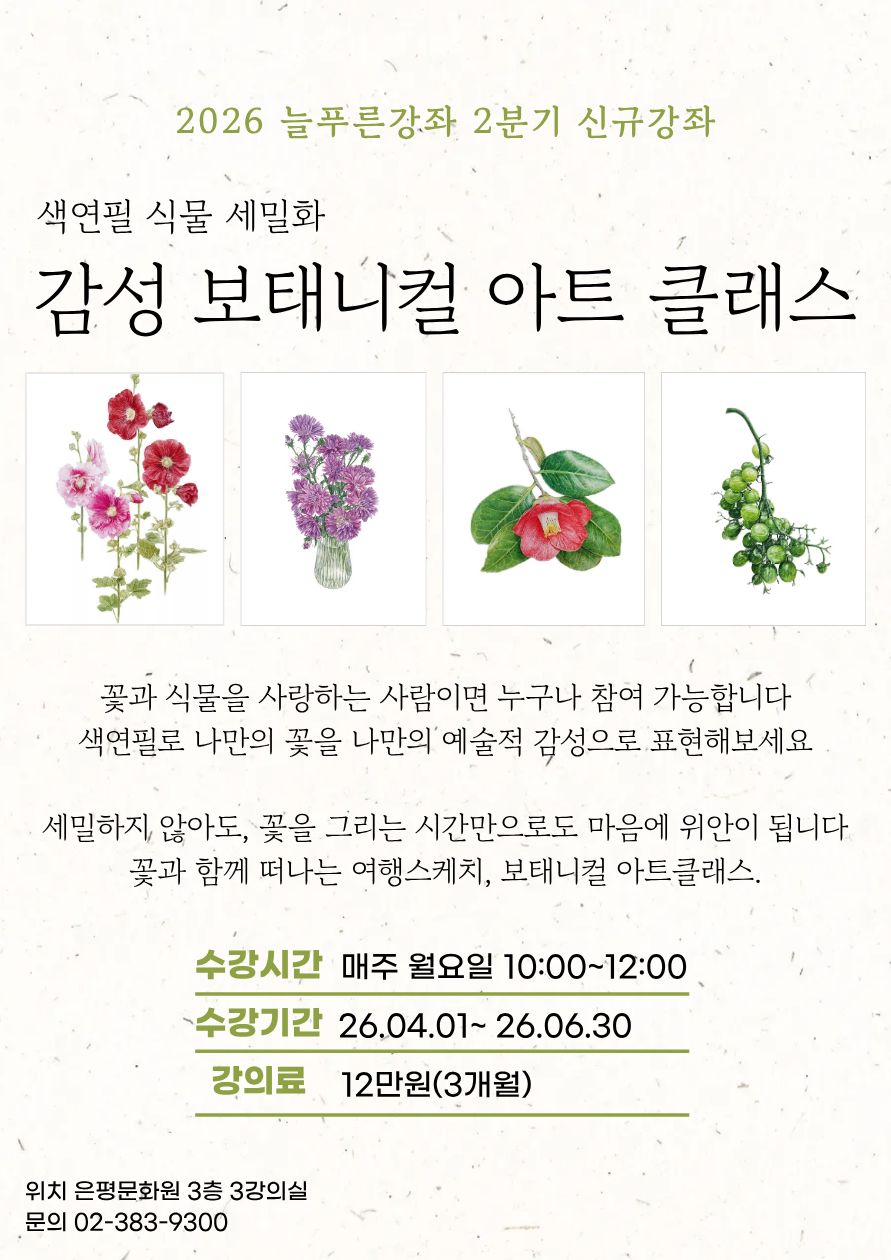 2026 은평문화원 2분기 늘푸른강좌 수강생을 모집합니다🍃 ✔️ 수업일자 2026.4.1. - 6.30. ✔️ 접수기간 🔹 기존 수강생: 2026.3.16. - 3.20. (5일) 🔹 신규 수강생: 2026.3.23. - 3.27. (5일) ✔️ 접수시간 평일 09:30 - 17:00 ✔️ 접수방법 온라인 수강신청 및 방문접수 ✔️ 방문접수 은평문화원 3층 사무국 은평문화원 서울특별시 은평구 수색로 2...