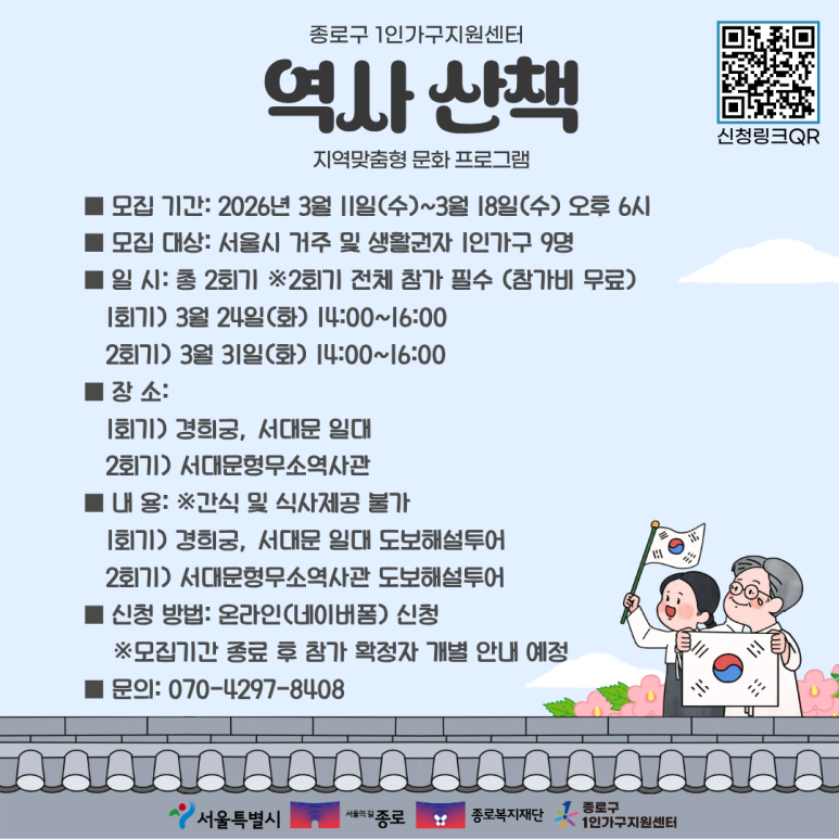 🏛 종로구 1인가구지원센터 <역사산책> 참여자 모집 1인가구를 위한 지역맞춤형 문화 프로그램 <역사산책> 참여자를 모집합니다. <역 사 산 책> 은 종로의 역사문화 자원을 직접 탐방하며 경희궁과 서대문형무소 역사관을 함께 둘러보는 프로그램 입니다. 도보 해설과 함께 지역의 역사와 이야기를 깊이 있게 경험할 수 있는 기회이니 많은 관심 바랍니다. 📌 모집 안내 모집기간 : 2026년 3월 11일(수) ~ 3월 18일(수) 오후 6시까지 모집대상 : 서울시 거주 및 생활권자 1인가구 9명 📌 운영 일정 일시 (※ 2회기 모두 참여 필수 / 참가비 무료) 1회기 : 2026년 3월 24일(화) 14:00 ~ 16:00 2회기 : 2026년 3월 31일(화) 14:00 ~ 16:00 장소 1회기 : 경희궁, 서대문 일대 (서울 종로구 새문안로 45) 2회기 : 서대문형무소역사관 (서울 서대문구 통일로 251) ※ 간식 및 식사 제공 없음 📌 프로그램 내용 1회기 : 경희궁 및 서대문 일대 도보 해설 투어 2회기 : 서대문형무소역사관 도보 해설 투어 📌 신청 방법 온라인 신청 (네이버폼) ※ 모집 마감 후 선정자에 한해 개별 안내 예정 신청링크 : https://form.naver.com/response/fHDfFUJQ59V--gnc4rxQNg 📞 문의 종로구 1인가구지원센터 070-4297-8408