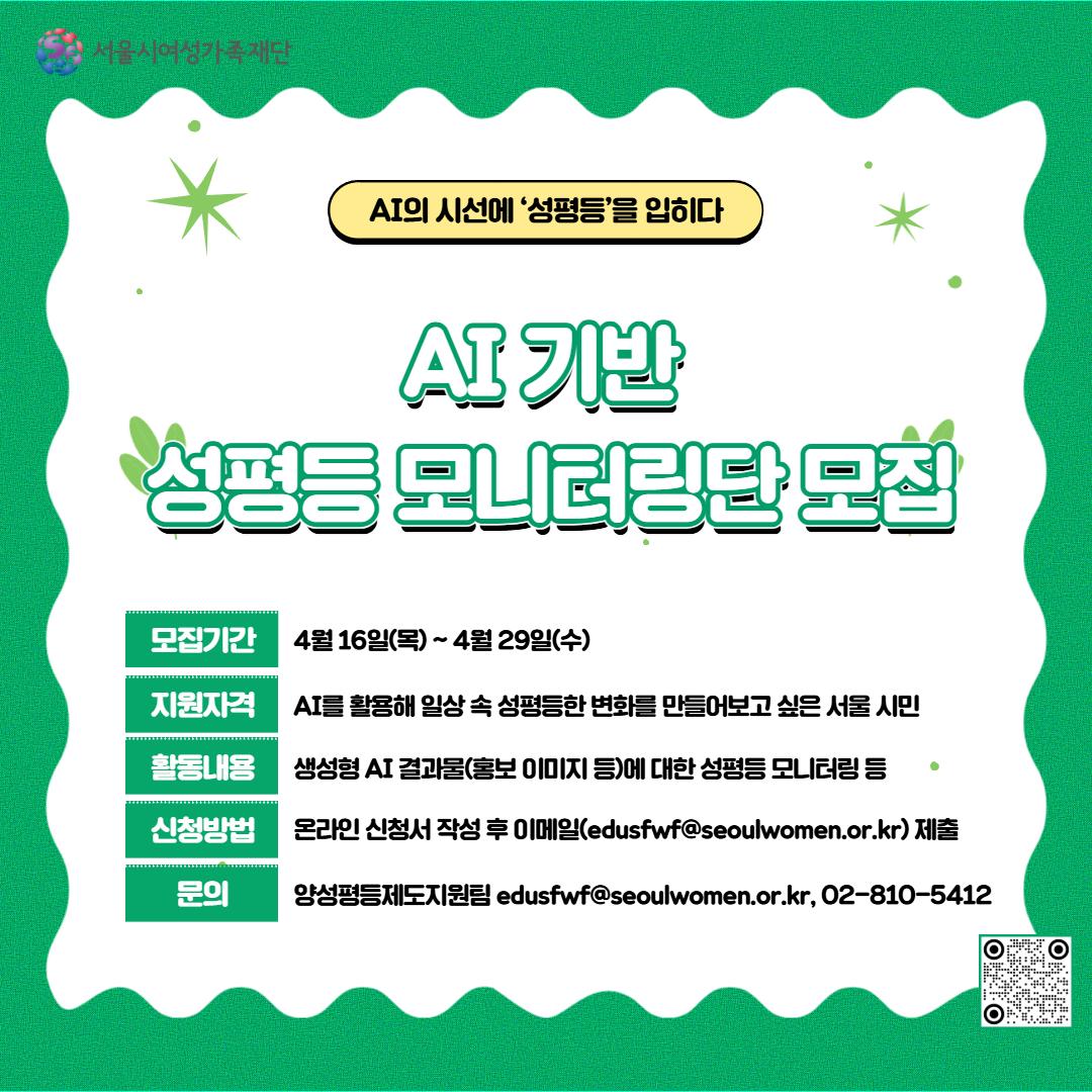•사업목적: 시민 참여 모니터링을 통해 생성형 AI 콘텐츠의 성별 편향을 점검하고 성평등한 공공 AI 활용 기준 마련 •신청대상: AI를 활용해 일상 속 성평등한 변화를 만들어보고 싶은 서울 시민 •신청기간: 4월 16일(목) ~ 4월 29일(수) •진행일정: 5월~9월 •진행내용: 생성형 AI 결과물(홍보이미지 등)에 대한 성평등 모니터링, AI 기반 성평등체크리스트 개발 참여 •진행장소: 서울여성플라자(대방역 부근) •참여혜택: 성평등 모니터링단 위촉장 발급, 소정의 활동비 지급, 우수 활동자 표창 •문의: 서울시여성가족재단 양성평등제도지원팀(02-810-5412, edusfwf@seoulwomen.or.kr)