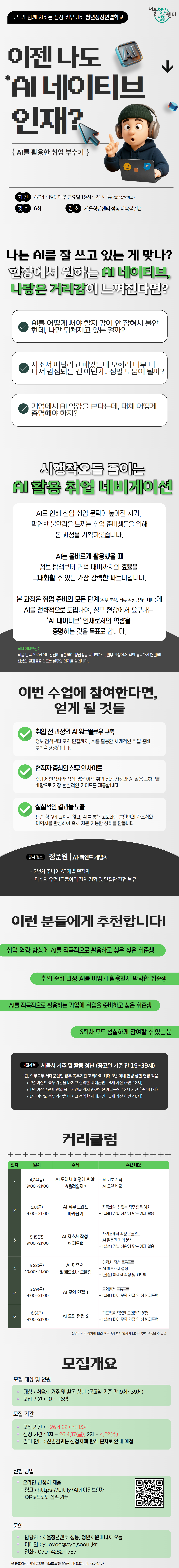 ✨신청하러 가기 ✨ https://forms.gle/s djK1FBLorBdEs4q8 🔹강의명 : 이제 나도 AI 네이티브 인재 🔹청년 강사 : 정준원 - 現 AI·백엔드 개발자 - 2년차 주니어 AI 개발 현직자 - 다수의 유명 IT 동아리 강의 경험 및 면접관 경험 보유 🔹강의 일정 및 주제 ① 26.4.24(금) 19:00~21:00 AI 도대체 어떻게 써야 효율적일까? ② 26.5.8(금) 19:00~21:00 AI 직무 트렌드 따라잡기 ③ 26.5.15(금) 19:00~21:00 AI 자소서 작성 & 피드백 ④ 26.5.22(금) 19:00~21:00 AI 이력서 & 페르소나 모델링 ⑤ 26.5.29(금) 19:00~21:00 AI 모의 면접 1 ⑥ 26.6.5(금) 19:00~21:00 AI 모의 면접 2 🔹대상 및 인원 - 대상 1) 취업 역량 향상에 AI를 적극적으로 활용하고 싶은 싶은 취준생 2) 취업 준비 과정 AI를 어떻게 활용할지 막막한 취준생 3) AI를 적극적으로 활용하는 기업에 취업을 준비하고 싶은 취준생 - 인원 : 10~16명 - 지원 자격 : 서울시 활동 및 거주 청년 (공고일 기준 만19세~39세) * 단, 의무복무 제대군인인 경우 복무기간 고려하여 최대 3년 이내 연령 상한 연장 적용 ‣ 2년 이상의 복무기간을 마치고 전역한 제대군인 : 3세 가산 (~만 42세) ‣ 1년 이상 2년 미만의 복무기간을 자치고 전역한 제대군인 : 2세 가산 (~만 41세) ‣ 1년 미만의 복무기간을 마치고 전역한 제대군인 : 1세 가산 (~만 40세) 🔹장 소 : 서울청년센터 성동 다목적실2/다목적실1 (주소: 서울시 성동구 마조로 66, 라봄성동 2층, 210호) 🔹모집기간 : ~ 4/22(수) 13시 🔹참여자 유의사항 - 개인 노트북 지참 필수 : 원활한 실습 진행을 위해 개인 노트북을 반드시 지참해 주세요. - AI 도구 사전 준비 권장 : 사용할 수 있는 AI가 있으면 더욱 수업 활용도가 높습니다 - 서류 기초 자료 준비 : 본인의 이력서 및 자기소개서 초안 을 미리 정리해 오시면, AI를 활용한 첨삭 및 최적화 실습에 큰 도움이 됩니다. 🔹문의 : 서울청년센터 성동, 오늘 매니저 - 메일 : yuoyeo@syc.seoul.kr - 전화 : 070-4282-1757 💥 모두가 함께 자라는 성장 커뮤니티 ' 청년성장연결학교' 이 프로그램은 청년 강사가 자신의 역량을 현장에서 직접 실험하며 전문가로 발돋움할 수 있는 기회를 제공합니다. 동시에 참여하는 청년들이 고립되지 않고 건강한 관계 안에서 함께 성장할 수 있도록 돕는 관계망 지원 사업 입니다. 나만의 콘텐츠를 가진 이와 새로운 연결을 꿈꾸는 청년들이 만나 서로의 내일을 응원하는 학교입니다.
