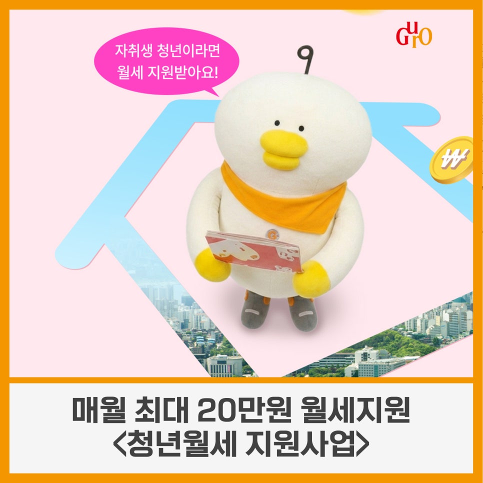 매월 최대 20만원 월세지원 <청년월세 지원사업>📢 구로구에서 자취하는 청년 주목! 매달 월세 20만원 아끼는 🍯꿀팁 드려요! 꿈을 찾아 서울로, 구로구로 올라온 청년 여러분 매달 나가는 월세가 큰 부담이셨죠? 여러분의 새로운 시작과 도전을 응원하기 위해 최대 2년간 매월 20만원 월세를 지원합니다! 부모님과 떨어져 혼자 살고 있다면? 지금 바로 확인해보세요!👍 ✅ 지원대상...