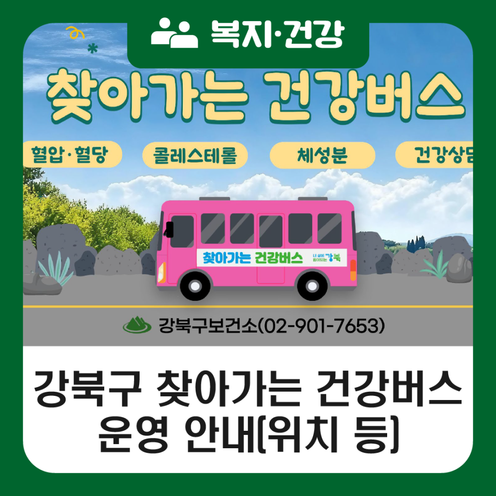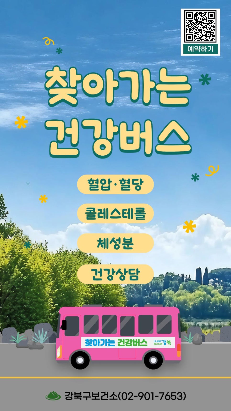 강북구에서는 보건소 이용이 어려운 구민들의 건강관리 접근성 향상 및 건강증진을 위해 '찾아가는 구민 건강버스'를 운영하고 있습니다. 관련 운영 시간 및 요일별 장소를 알려드리오니 많은 이용 부탁드립니다. 감사합니다. ○ 대상: 20세 이상 강북구민 또는 강북구 소재 직장인 누구나 ○ 검사항목: 혈압/혈당, 콜레스테롤, 체성분, 스트레스 등 ○ 운영시간 및 장소 - 주간...