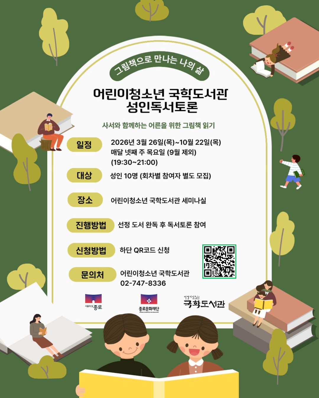 종로 어린이청소년 국학도서관 <사서와 함께하는 독서동아리> 참여자 모집! 선정 도서를 함께 읽고 이야기를 나누는 독서 모임에 관심 있는 분들의 많은 참여 바랍니다. 📌 운영 안내 ▪ 운영기간 2026. 3. 26. ~ 10. 22. ※ 매월 넷째 주 목요일 진행 (9월 제외) ▪ 운영장소 어린이청소년 국학도서관 세미나실 ▪ 진행방법 선정 도서를 완독한 후 독서 프로그램 참여 📌 모집 안내 ▪ 모집대상 성인 10명 (선착순) ※ 종로구민 접수 우대 📞 문의 02-747-8336 ※ 프로그램 신청 후 무단 결석 시 향후 참여가 제한될 수 있습니다.