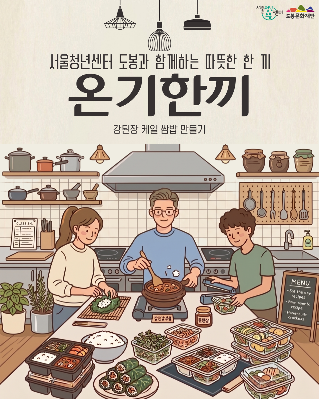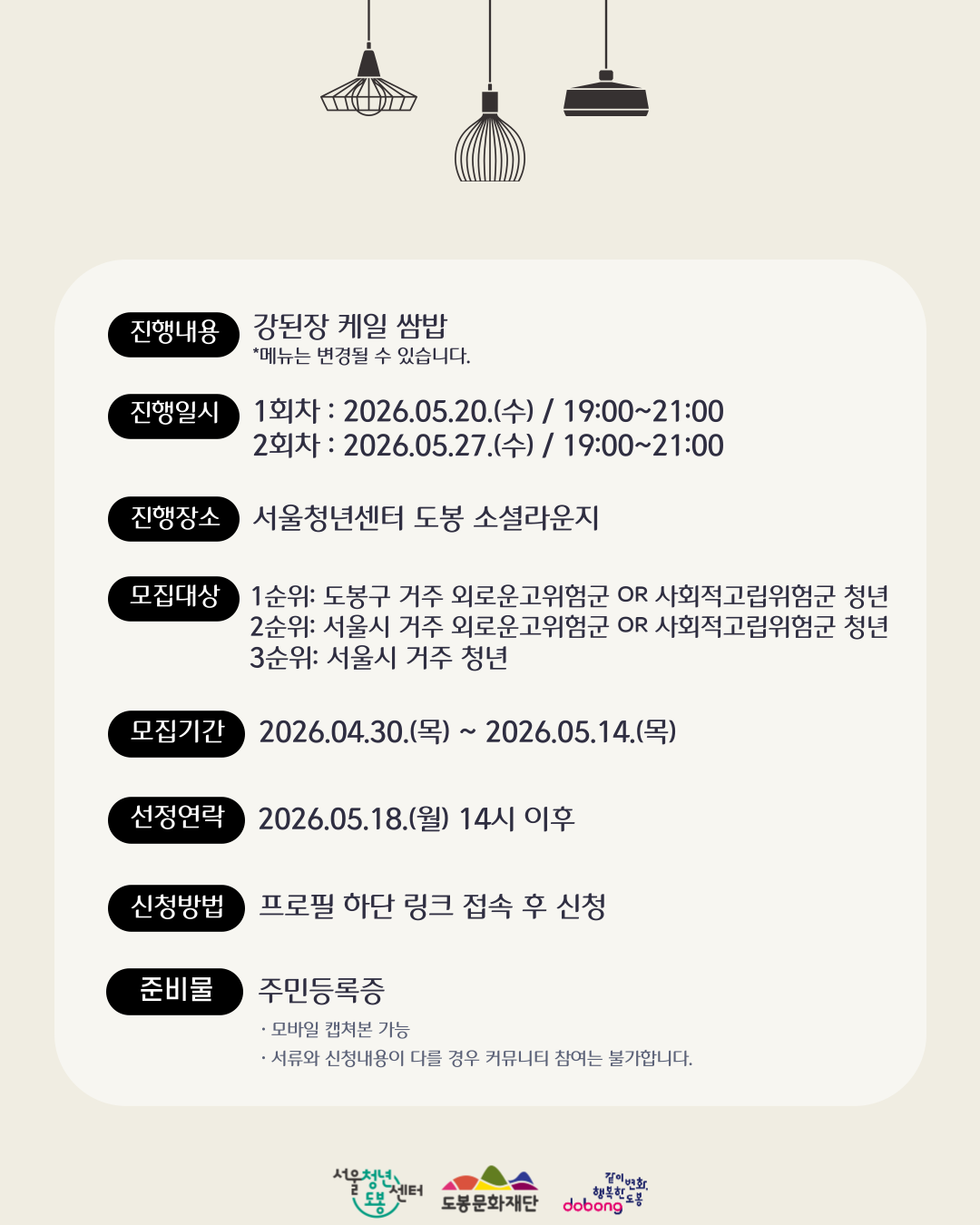 안녕하세요, 서울청년센터 도봉 에밀리 매니저입니다:) 5월 [온기한끼] 프로그램 참여자를 모집합니다💌 많은 관심 부탁드립니다.🤗 ◢ 진행일시 1회차: 2026.05.20.(수) 19:00~21:00 2회차: 2026.05.27.(수) 19:00~21:00 *중복 지원 불가 ◢ 진행장소: 서울청년센터 도봉 소셜라운지 ◢ 진행내용 요리활동(with 오늘이음 식생활교육연구소 대표): 강된장 케일 쌈밥 *메뉴는 사정에 따라 변경될 수 있습니다. ◢ 모집대상 1순위: 도봉구 거주 외로운고위험군 or 사회적고립위험군 청년 2순위: 서울시 거주 외로운고위험군 or 사회적고립위험군 청년 3순위: 서울시 거주 청년 ◢ 모집기간: 2026.04.30.(목)~2026.05.14.(목) 까지 ◢ 선정연락: 2026.05.18.(월) 14시 이후 ◢ 신청방법 하단의 링크 접속 후, 5월 온기한끼 신청 → https://forms.gle/KsUu87BtSQmsrX7C6 ◢ 준비물: 신분증(주거지 확인용) *모바일 캡쳐 화면 가능 *서류와 신청내용이 다를 경우, 프로그램 참여가 불가합니다. ◢ 공지사항 *본 프로그램은 냉동식품 및 햇반이 제공되지 않습니다. *5월 온기한끼에서는 요리포장용기가 제공됩니다. *불, 칼 등 주방용품을 사용하는 활동으로 안전에 유의하여 주시기 바랍니다. *공지사항 미숙지로 발생한 불이익은 책임지지 않습니다. 📞기타문의사항 서울청년센터 도봉 에밀리 매니저 070-8853-6554