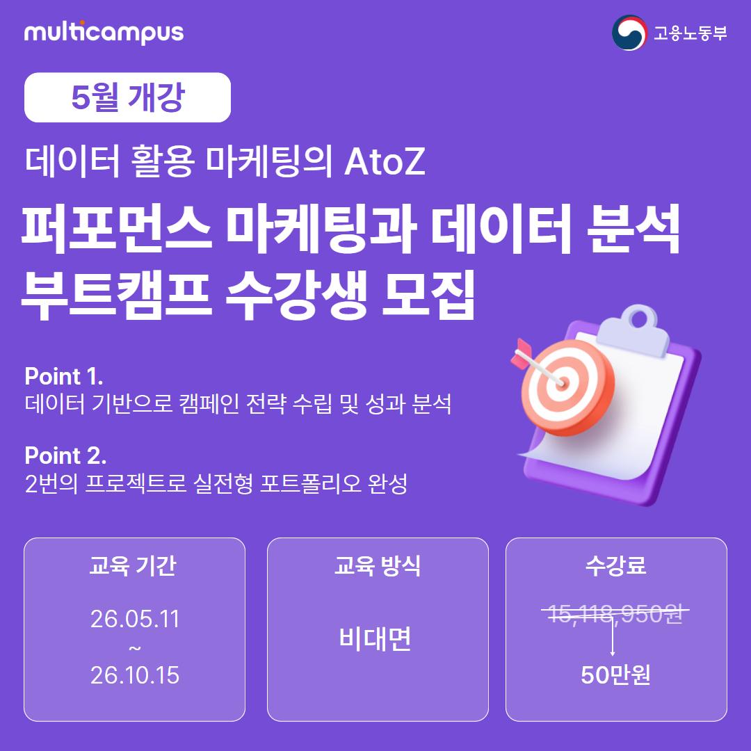 안녕하세요. 삼성그룹 교육전문기업 멀티캠퍼스입니다. 마케팅 포트폴리오 경험이 쌓였다면, 이제 성과가 필요할 때! 데이터 분석 역량을 통한 캠페인 전략 수립과 광고 성과 분석 경험을 통해 '차별화'된 역량을 키울 수 있는 퍼포먼스 마케팅과 데이터 분석 부트캠프 수강생을 모집하고 있습니다. 마케터로서의 취업을 목표로 하고 있거나 마케팅 역량을 키워나가고 싶은 예비 수강생분들의 많은 관심과 참여를 부탁드립니다. ■ 멀티캠퍼스와 함께 이렇게 성장할 수 있어요! - 마케팅 툴 활용 역량 획득 : 트래픽 분석, 캠페인 효과를 측정하여 마케팅 현업에 즉시 투입될 수 있어요. 활용 툴 : GA, Looker Studio - 데이터 분석 역량 획득 : 고객 여정과 세그먼트를 분석하는 데이터 분석 기반 마케팅 직무로 확장 가능해요. 활용 툴 : SQL, Python, Tableau - 예측 모델링 역량 획득 : A/B테스트 설계, 시스템화로 마케팅 자동화 및 거시적인 전략 수립이 가능해요. 활용 툴 : 머신러닝, 딥러닝, 모델링 ■ 수료 후 이런 분야로 취업해요. 퍼포먼스 마케터, CRM 마케터, 광고 컨설턴트 ■ 커리큘럼 요약 - 1개월 : 퍼포먼스 마케팅 개론 및 광고 플랫폼 이해, 데이터분석 기초 - 2개월 : 데이터 분석 시각화 및 미니 프로젝트, 마케터를 위한 데이터분석 심화 - 3개월 : 퍼포먼스 마케팅 심화, 마케터를 위한 데이터 분석 심화 - 4개월 : 데이터분석 현업 적용 프로젝트1, 애자일 방법론 및 멘토링 - 5개월 : 데이터분석 현업 적용 프로젝트2, 현업 프로세스 체험 및 멘토링, 취업용 포트폴리오 제작 ■ 수강생 혜택 ① 매월 최대 30만원 훈련장려금 제공 ② 수료 후 6개월까지 인턴+취업 무한매칭 제공 ③ 수료 후 6개월까지 취업지원서비스제공(자소서첨삭, 면접클리닉, 채용연계 등) ④ 학습기간동안 장비 무상 지원 ■ 교육 신청 안내 - 교육 일정 : 26년 5월 11일(월) ~ 2026년 10월 15일(목) - 신청 기간 : 26년 5월 11일(월)까지 - 교육 시간 : 9:00~18:00 - 교육 장소 : 100% 비대면 (온라인 100% 수업) - 모집 대상 : 국민내일배움카드 발급자 누구나 - 수강 신청 바로 가기 : https://buly.kr/BeLy3wv ■ 문의처 카카오톡 : 멀티캠퍼스 IT취업교육 http://pf.kakao.com/_ghxnms