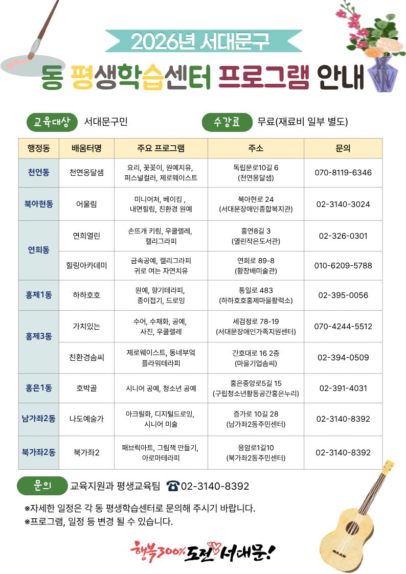 2026년 서대문구 동 평생학습센터(동네배움터) 안내 서대문구 동 평생학습센터는 지역 주민들이 다양한 학습 기회를 제공받을 수 있는 공간입니다. 센터에서는 다양한 프로그램과 강좌가 운영되며, 주민들이 서로 소통하고 배울 수 있는 장을 마련하고 있습니다. 자세한 프로그램 일정 및 신청 방법은 서대문구청 공식 웹사이트를 통해 확인하실 수 있습니다. 많은 관심과 참여 부탁드립니다!