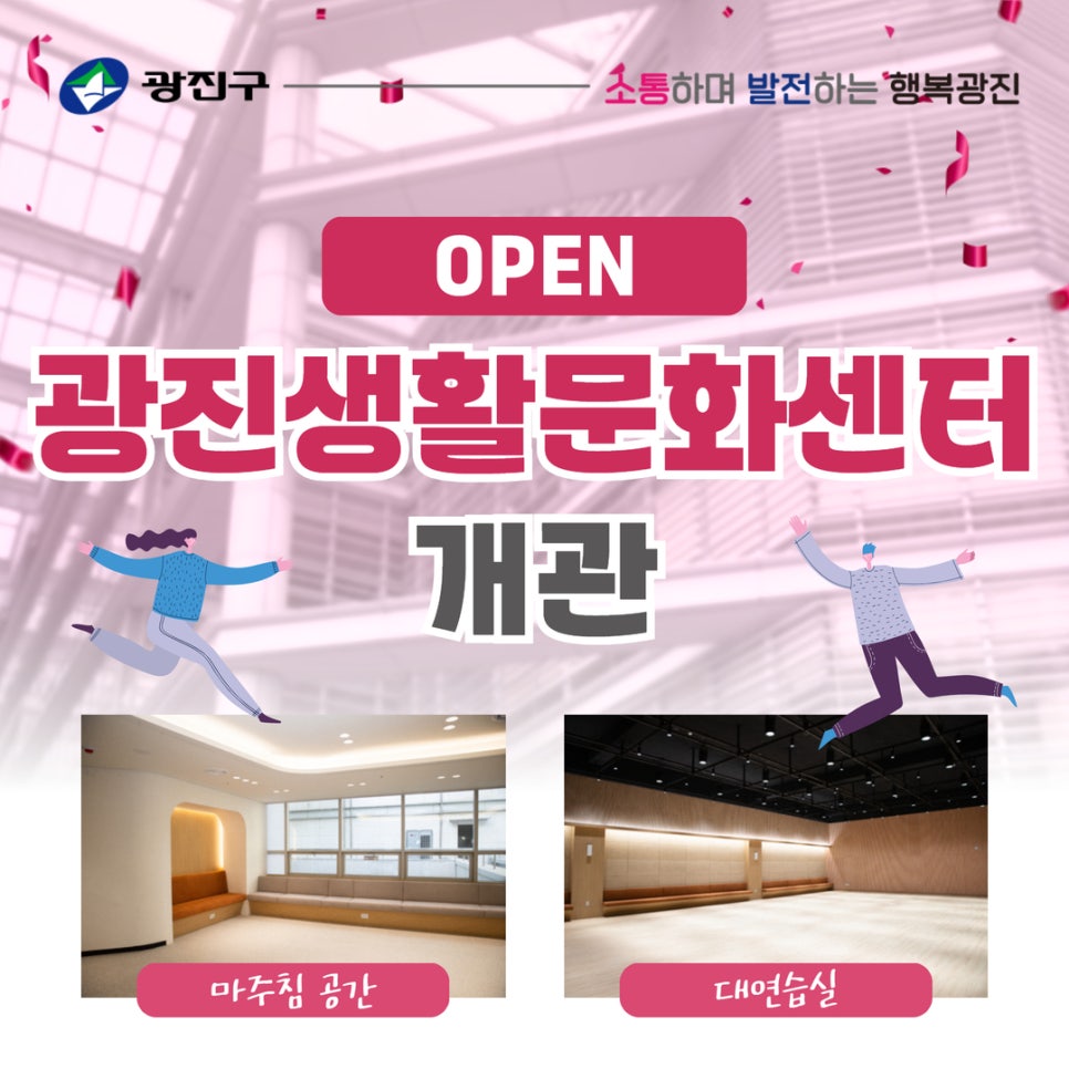 자기 계발, 회의 공간, 연습실, 대강당 등 목적에 맞는 공간을 구하기 어려우셨다면 2월 10일 개관하는 광진생활문화센터를 이용해보세요! 대관뿐만 아니라 시설에서 생활문화프로그램 운영도 가능하니 광진문화재단 홈페이지에서 신청하세요!🙋🏻♀️ 💸 대상 · 광진구 거주자 또는 광진구 기반 활동 예술가(단체) ※증빙자료 제출 必 (주민등록등본, 사업자등록증, 고유번호증 등)