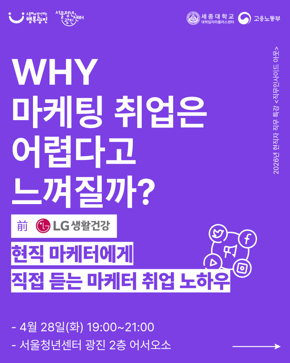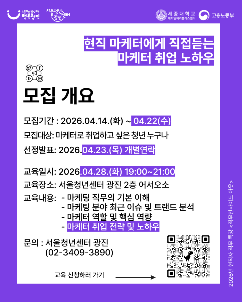 서울청년센터광진<2026년 현직자 특강 직무인사이드 아웃 "마케팅편" 참여자 모집>(~4/22) 안녕하세요. 서울청년센터 광진입니다. 마케팅 취업… 왜 이렇게 어렵게 느껴질까? 🤔 답은 ‘현직자 이야기’에 있습니다. 2026년 현직자 특강 〈직무 인사이드아웃〉 두 번째 이야기! "마케팅 편“ 전) LG생활건강 마케터가 들려주는 리얼 마케팅 직무 이야기와 취업 전략🔥 ✔ 마케팅 직무의 기본 이해 ✔ 최신 마케팅 트렌드 및 이슈 분석 ✔ 마케터에게 필요한 핵심 역량 ✔ 취업까지 연결되는 실전 노하우 막연했던 마케팅 취업, 이제는 방향을 잡아보세요! [모집개요] ✍모집 기간: 2026년 4월 14일(화) ~ 2026년 4월 22일(수) ✍진행 일정: 2026년 4월 28일(화) 19:00~21:00 ✍진행 장소: 서울청년센터 광진 어서오소 (광진구 능동로 245, 2층) ✍참여 대상: 마케터로 취업을 희망하는 청년(19세~39세) 누구나! ※ 단, 의무복무 제대군인인 경우 복무기간 고려하여 최대 3년 이내 연령 상한 연장 적용 ✍진행 내용: - 마케팅 직무의 기본 이해 - 마케팅 분야 최신 이슈 및 트렌드 분석 - 마케터 역할 및 핵심 역량 - 마케터 취업 전략 및 노하우 ✍선정발표: 2026년 4월 23일(목) 개별 문자 안내 ✍신청방법: 구글 설문지 작성 후 제출( https://forms.gle/hChZZ4zoQ2WQobt37 ) ✍문의: 서울청년센터 광진 (02-3409-3890) [안내사항] 📢 해당 교육은 고용노동부 사업의 일환으로 운영되며, 수기 신청서(개인정보동의서 포함) 작성이 필수입니다. 현장에서 원활한 진행을 위해 협조 부탁드립니다. 📢 프로그램 신청 후 노쇼 3회 이상 시 해당 프로그램 참여가 어렵습니다.