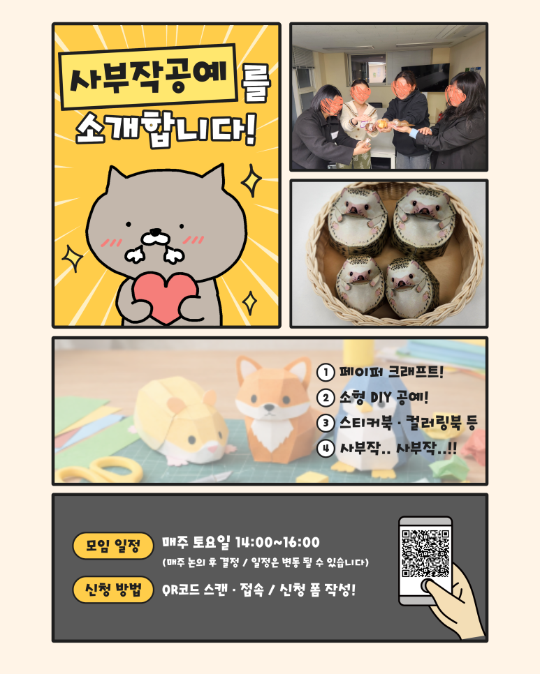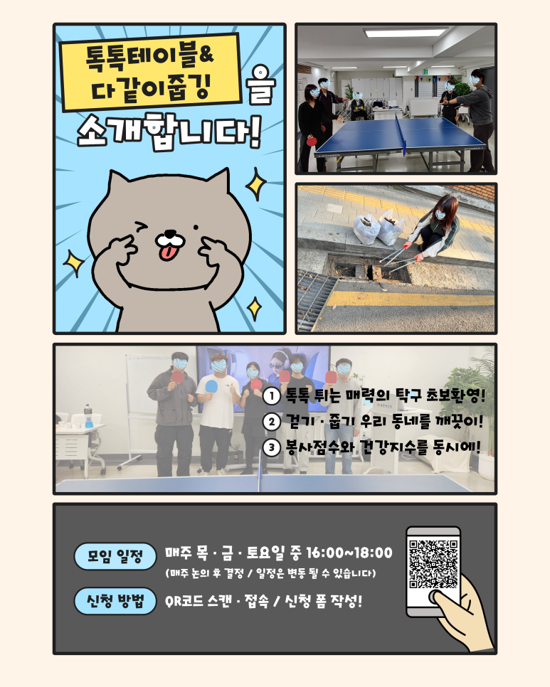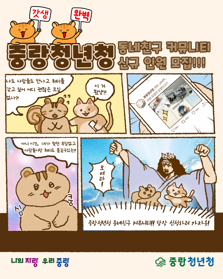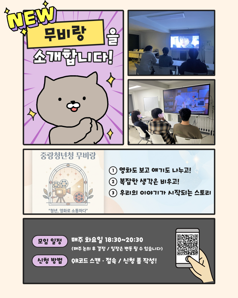 중랑청년청<동네친구 커뮤니티 소모임 참여자 모집> 심심한 일상에 '갓생' 한 스푼 추가하실 분? 🙋♂️🙋♀️ 중랑청년청에서 새로운 동네친구 커뮤니티 신규 인원을 모집합니다! 혼자 놀기 지루한데 어디 괜찮은 모임 없나..? 고민하던 중랑구 청년들 주목! 취미도 즐기고 친구도 사귈 수 있는 3가지 꿀모임을 소개합니다! ✨ 🎬 1. 무비랑 (영화 감상 모임) ⏰매주 화요일 18:30~20:30 청년, 영화로 소통하다! 퇴근 후 힐링 타임 혼자 보는 영화도 좋지만, 영화가 끝난 뒤 밀려오는 감동을 누군가와 나누고 싶지 않나요? '무비랑'은 단순히 영화만 보는 게 아니에요! 🎨 2. 사부작공예 (페이퍼크래프트 모임) ⏰매주 토요일 14:00~16:00 내 손으로 직접 만드는 소소하지만 확실한 행복 손재주 없는데 괜찮을까? 고민은 NO! 사부작.. 사부작.. 무언가에 집중하다 보면 스트레스는 어느새 안녕! 🏓 3. 톡톡테이블 & 다같이줍깅 ⏰매주 목·금·토 중 16:00~18:00 톡톡 튀는 탁구 한 판 & 우리 동네를 지키는 갓생 루틴 운동도 하고 싶고, 보람찬 일도 하고 싶은 욕심쟁이 청년들 모여라! 건강 지수와 봉사 점수를 동시에 잡는 일석이조 모임입니다. 📍 신청방법: 이미지 내 QR코드 스캔 후 신청 폼 작성! 📍 부담 없이 지원하세요! 중랑청년청 동네친구 커뮤니티는 여러분의 참여를 기다리고 있어요! 고민은 신청만 늦출 뿐! 지금 바로 QR코드로 접속해서 우리 같이 즐거운 중랑 생활 만들어가요! 🔥