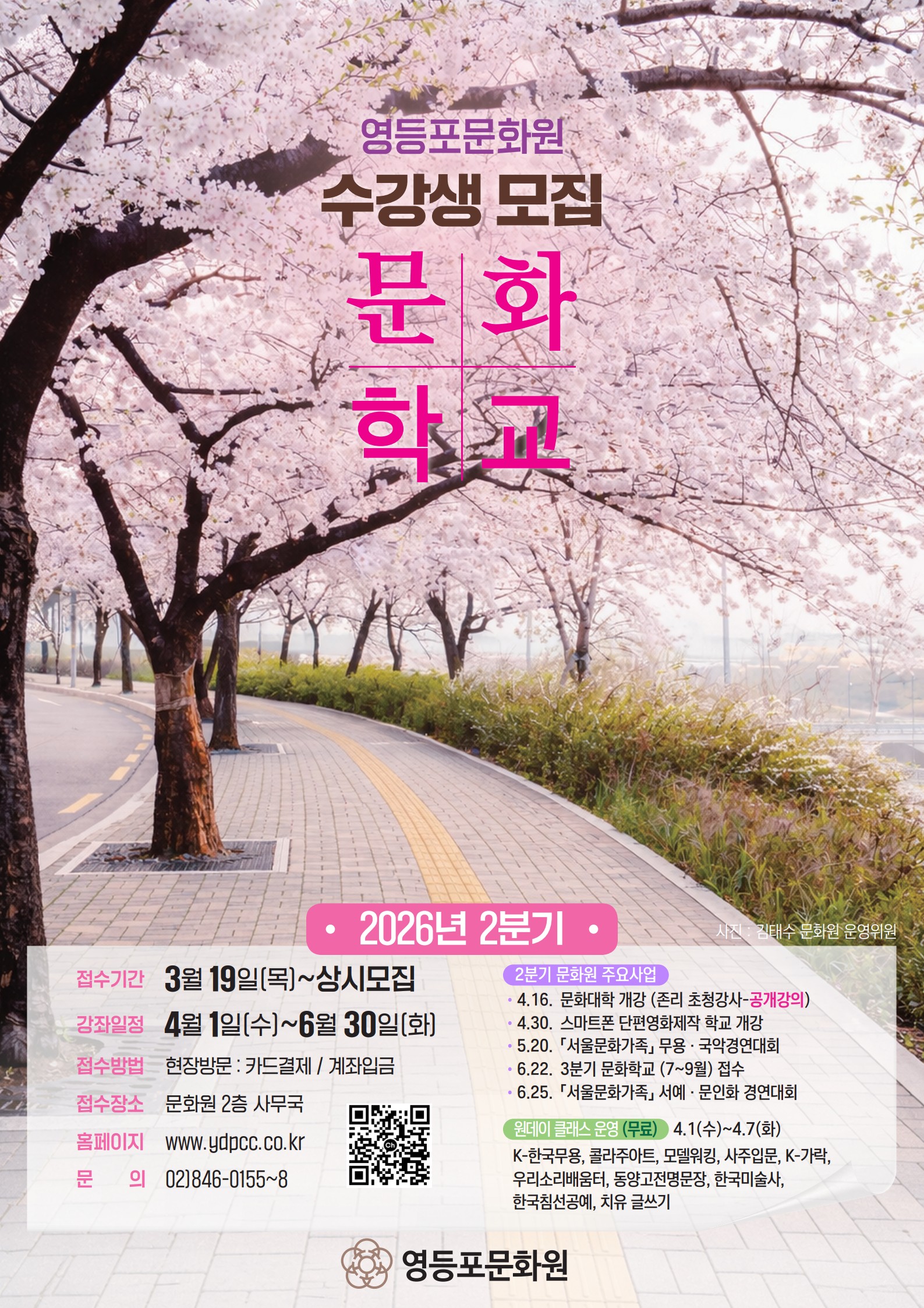 영등포공원에 위치한 영등포문화원에서 '2분기 문화학교' 수강생을 모집하고 있으니 많은 신청 바랍니다. 자세한 사항은 붙임 팜플렛을 참고하시기 바랍니다. □ 영등포문화학교 2분기(4~6월) 수강생 모집 ○ 신청기간: 3. 19.(목) ~ 상시접수 ○ 강좌내용: 전통, 생활, 예술, 음악, 건강, 어학 등 140여 개 강좌 ○ 교육기간: 4. 1.(수) ~ 6. 30.(화) [3개월] ○ 접수방법: 영등포문화원 2층 사무국 방문 접수 ○ 문 의: 02-846-0155~8 / www.ydpcc.co.kr