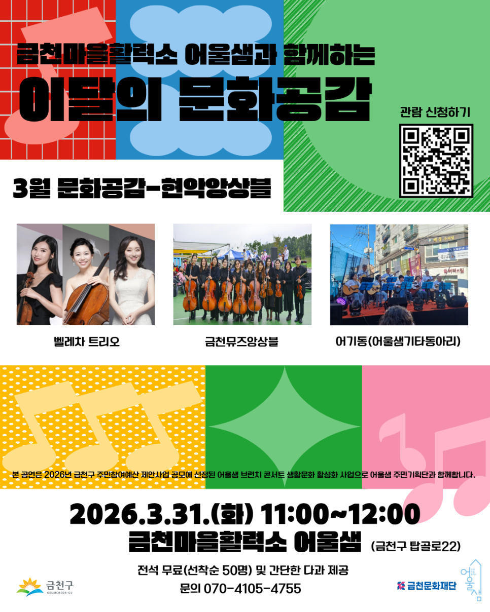 금천문화재단에서 현악 앙상블 공연을 개최하니 관심 있는 사람들의 참여를 기다리고 있어.