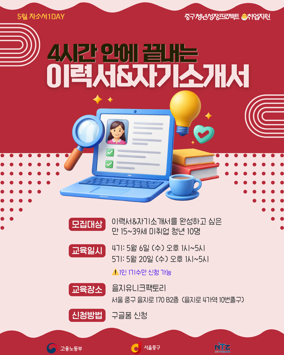[📝 자소서 1DAY – 매주 한 걸음, 나답게] 도대체 나는 뭘 해야 하지? 이력서 앞에서 멈칫했던 날, 자기소개서를 쓰다 창을 꺼버린 순간. 그 마음으로 충분해요. 지금, 여기서부터 다시 시작해 볼 수 있어요. 🌱 이런 분들에게 추천해요! ✔️ 이력서·자소서가 막막하게 느껴지는 분 ✔️ 내 경험을 정리해 ‘나다운’ 문장으로 만들고 싶은 분 ✔️ 혼자 말고, 함께 응원받으며 취업 준비하고 싶은 청년 ✔️ ‘어떻게든 취업’보다, ‘나답게 일하고 싶은’ 분 📌 대상 취업 준비가 막막한 만 15세~39세 청년 👥 정원 10명 (※ 미취업 청년 우선 선발) 📆 일정 4기: 5. 6. (수) 13:00~17:00 5기: 5. 20. (수) 13:00~17:00 ※ 매회 단일 프로그램, 원데이 구성 📍 장소 을지유니크팩토리 (서울 중구 을지로 170, 을지로4가역 10번 출구 B2) 📝 신청 기간 현재 ~ 2026. 4. 30. (목)까지 ※ 신청자 많을 시 조기 마감될 수 있습니다. 📩 참여 안내 프로그램 시작 D-7 📌 신청 방법 ☑️ 프로필 링크 ❤️ 문의 https://pf.kakao.com/_ytIPn/ 🚨신청 후 '노쇼'하는 경우, 이후 프로그램 참여가 제한될 수 있습니다. 🚨이 프로그램은 2026 중구 청년성장프로젝트의 일환으로 고용노동부, 서울시 중구의 지원으로 진행됩니다.