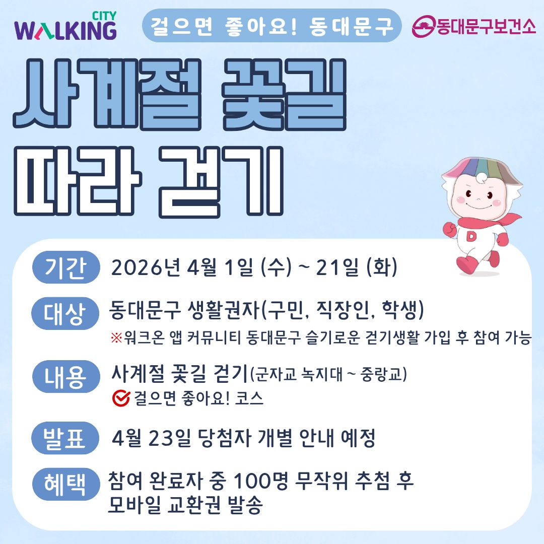 🌸사계절 꽃길 따라 걷기 ✔기간: 2026년 4월 1일(수) ~ 4월 21일(화) *21일간 ✔대상: 동대문구 생활권자 (구민, 직장인, 학생) * 워크온 앱 동대문구 커뮤니티 가입 후 참여 가능 ✔내용: 사계절 꽃길(배봉산 둘레길↔️겸재교↔️장안벚꽃길 북카페↔️장평근린공원) ✔참여방법 1. 워크온 앱 설치 및 실행 2. "사계절 꽃길 따라 걷기" 챌린지 참여하기 3. ...