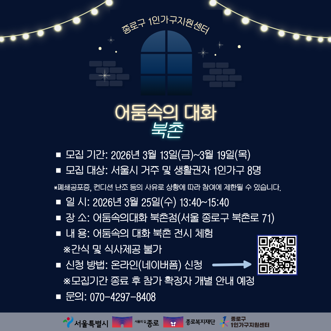🎭 종로구 1인가구지원센터 <어둠속의 대화> 참여자 모집 1인가구를 위한 지역맞춤형 문화 프로그램 <어둠속의 대화> 참여자를 모집합니다. <어둠속의 대화>는 시각을 차단한 환경에서 다양한 감각을 통해 소통을 경험하는 전시 입니다. 일상과는 다른 경험을 통해 새로운 시각을 얻을 수 있는 프로그램이니 많은 관심 바랍니다. 📌 모집 안내 모집기간 : 2026년 3월 13일(금) ~ 3월 19일(목) 오후 11시 30분까지! 모집대상 : 서울시 거주 및 생활권자 1인가구 8명 ※ 폐쇄공포증, 건강 상태 등에 따라 참여가 제한될 수 있습니다. 📌 운영 일정 일시 : 2026년 3월 25일(수) 13:40 ~ 15:40 장소 : 어둠속의대화 북촌점 (서울 종로구 북촌로 71) ※ 간식 및 식사 제공 없음 📌 신청 방법 온라인 신청 (네이버폼) ※ 모집 마감 후 선정자에 한해 개별 안내 예정 신청링크 : https://form.naver.com/response/fHDfFUJQ59V--gnc4rxQNg 📞 문의 종로구 1인가구지원센터 070-4297-8408