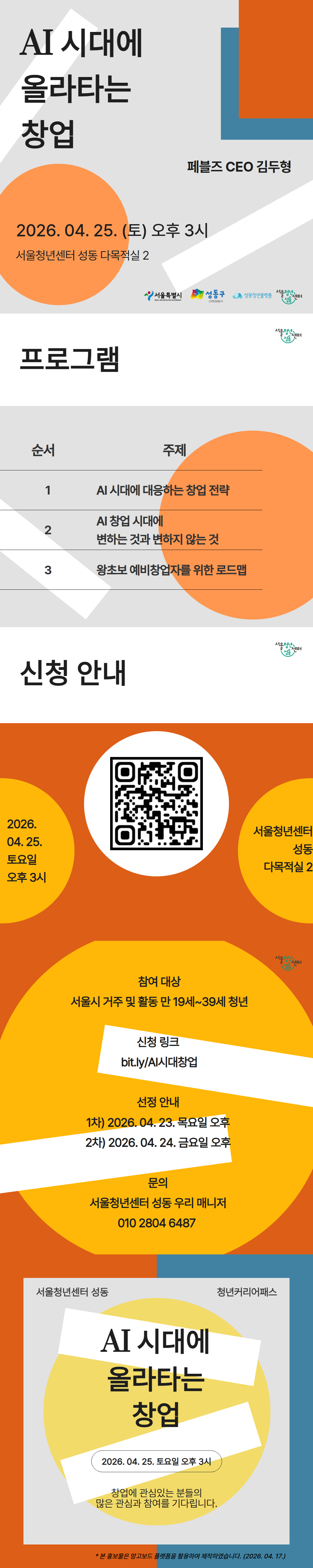 청년커리어패스 안녕하세요, 서울청년센터 성동 우리 매니저입니다. 청년커리어패스는 청년들이 진로를 탐색하는 과정에 맞춰, 구직, 실무, 회복탄력성 등 다채로운 커리어 역량을 강화하며 자신만의 커리어 여정을 찾아가도록 구성한 사업입니다. 이번 시간에는 창업에 대한 두 번째 강의로, 을 진행합니다. AI 시대의 창업에 대해 관심있는 분들의 많은 참여 부탁드립니다. 🧭 강사 김두형 페블즈 CEO 🧭 운영 일시 2026. 4. 25.(토) 오후 3시 🧭 활동 장소 서울청년센터 성동 다목적실 2 (서울시 성동구 마조로 66, 라봄성동 210호) 🧭 모집 대상 : 만 19세~39세 서울시 거주 또는 생활 청년 * 제대 군인의 경우, 복무 기간에 따라 만 42세까지 참여 가능 🧭 프로그램 구성 1. AI 시대에 대응하는 창업 전략 2. AI 창업 시대에 변하는 것과 변하지 않는 것 3. 왕초보 예비창업자를 위한 로드맵 🧭 신청 링크 bit.ly/AI시대창업 청년커리어패스 안녕하세요, 서울청년센터 성동 우리 매니저입니다. 청년커리어패스는 청년들이 진로를 탐색하는 과정에 맞춰, 구직, 실무, 회복탄력성 등 다채로운 커리어 역량을 강화하며 자신만의 커리어 여정을 찾아가도록 구성한 사업입니다. 이번 시간에는 창업에 대한 두 번째 강의로, 을 진행합니다. AI 시대의 창업에 대해 관심있는 분들의 많은 참여 부탁드립니다. 🧭 강사 김두형 페블즈 CEO 🧭 운영 일시 2026. 4. 25.(토) 오후 3시 🧭 활동 장소 서울청년센터 성동 다목적실 2 (서울시 성동구 마조로 66... docs.google.com 🧭 선정 안내 1차 : 2026. 4. 22.(수) 오후 중 선정자 대상 개별 문자 안내 2차 : 2026. 4. 23.(목) 오후 중 선정자 대상 개별 문자 안내 🧭 문의 서울청년센터 성동 우리 매니저 010-2804-6487