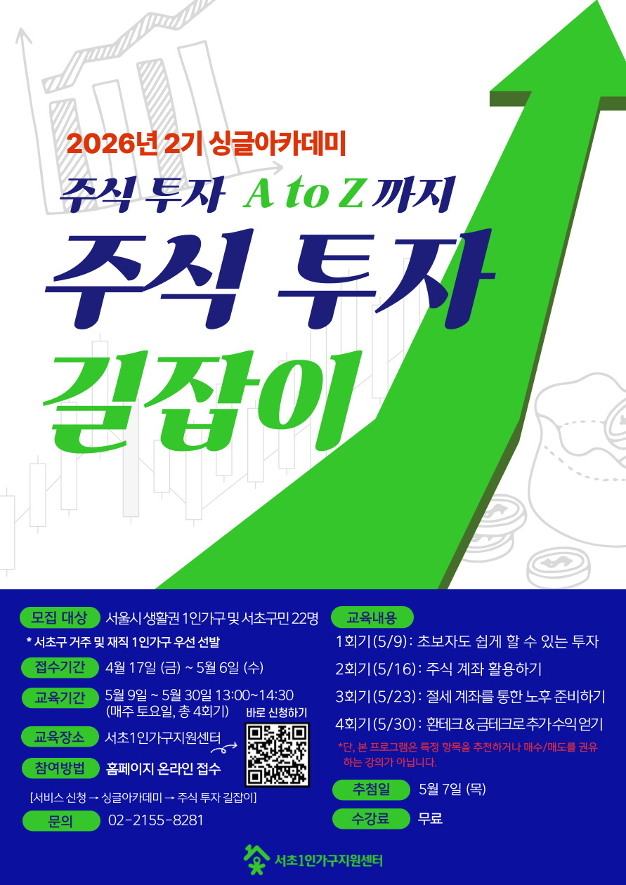 혼자여도 돈 불리는 법 배워야지! 5월 싱글아카데미에서 주식 투자 기초부터 차근차근 알려줄 거야.
