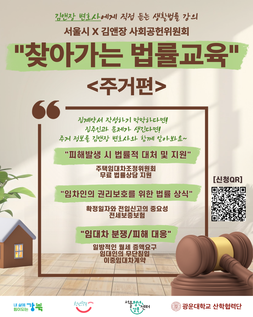김앤장 변호사에게 직접 듣는 생활법률 강의 '서울시 X 김앤장 사회공헌위원회 '찾아가는 법률교육' 전세·월세 계약, 아직도 불안하신가요? 😥 임차인이라면 꼭 알아야 할 권리와 대응 방법, 이번 기회에 제대로 배워보세요! 🏠📚 📌 일시: 2026.4.28(화) 19:20~20:30 📌 장소: 서울청년센터 강북 지하 1층 대교육실 (서울특별시 강북구 노해로23길 123, 강북청년창업마루) 📌 대상: 서울시 거주 또는 생활권 청년(만 19~39세) 20명 * 제대군인은 복무기간에 따라 최대 3년 연령 상한 연장 📌 주요 내용 ✔ 전세보증보험, 확정일자, 등기부등본 보는 법 🔍 ✔ 임대차 계약 시 필수 체크사항 ✍️ ✔ 전세사기 및 분쟁 유형과 대응 방법 🚨 ✔ 피해 발생 시 법적 대응 및 지원 안내 ⚖️ 📌 신청: 서울시 공공서비스예약 시스템 신청 * 사전 질문이 있을 시, 작성해주세요. * 사전 질문을 최대한 반영하고자 하나 상황에 따라 교육생의 사전 질문이 포함되지 않을 수 있습니다. 📌 주의사항 * 기관 사정에 따라 내용은 변경될 수 있습니다. * 교육시 촬영 및 녹음 금지됩니다. * 본 교육은 법률지식 교육입니다. 현장질문은 개인상담이 아닌 교육 시 궁금했던 법률지식만 질문해주세요. 📞 문의: 02-908-8236 💡 “알면 지키고, 모르면 당합니다!” 내 보증금 지키는 첫 걸음, 지금 신청하세요 🙌