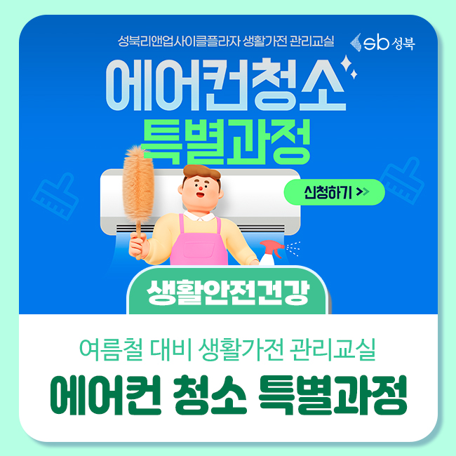 안녕하세요 성북누리입니다. 점점 다가오는 여름, 에어컨 청소의 시기가 다가오는데요, 성북리앤업사이클플라자에서 아주 특별한 생활가전제품 청소·관리 교육인 '에어컨 청소 특별과정'을 준비했습니다! 👏 5월부터 6월까지 월 2회씩 총 4회 진행 예정으로, 5월 수업을 못 들으셔도 6월 수업을 수강신청 하실 수 있습니다. 관심 있는 구민께서는 눈여겨 보시고 시원한 여름 맞이하세요! ✨💙🌬...