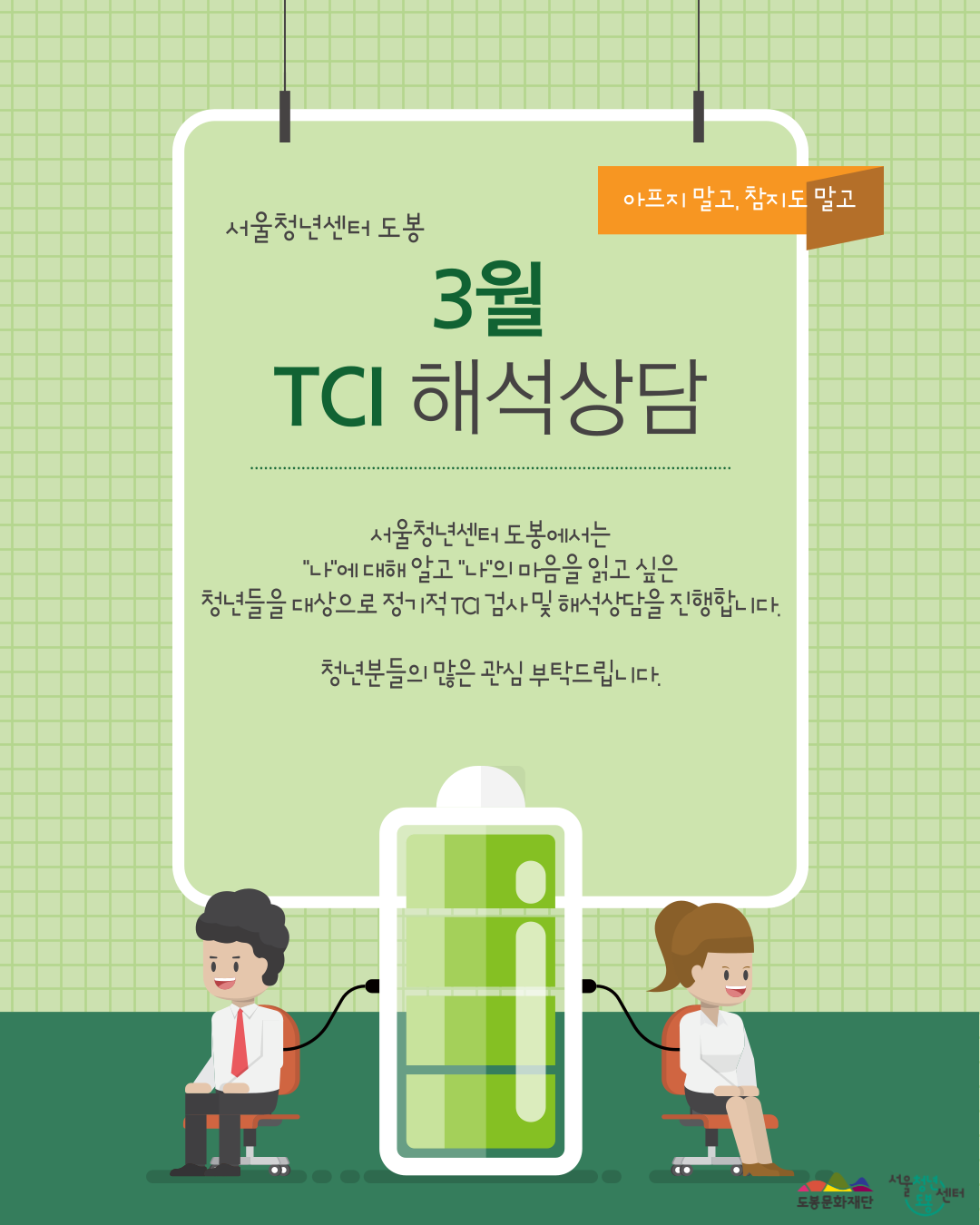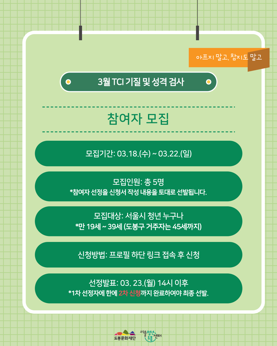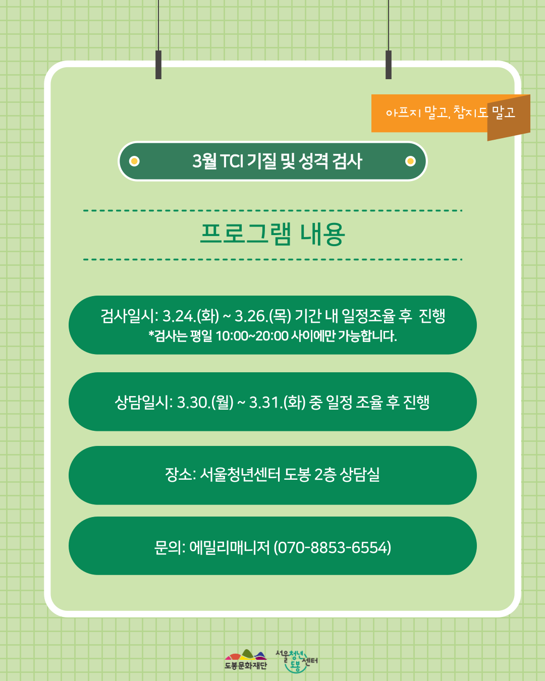안녕하세요, 서울청년센터 도봉 에밀리 매니저입니다:) 2026년 3월 TCI 기질 및 성격검사와 해석상담 참여자를 모집합니다💌 🧸 TCI 검사 일시 2026.03.24.(화)~2026.03.26.(목) 중 일정 조율 후 진행 *2025년 참여자는 중복지원 불가합니다. *검사는 평일 10:00~20:00 사이에만 가능합니다. 🧸 검사결과 해석 및 상담 일시 2026.03.30.(월)~2026.03.31.(화) 중 일정조율 후 진행 🧸 진행장소: 서울청년센터 도봉 2층 상담실 🧸 진행내용 1) 1차, 2차 신청서 작성 완료 후, 선정자에 한해 TCI 검사 진행 2) 상담사와 1:1 TCI 검사 결과 해석 및 상담 진행 🧸 모집대상 서울시 청년 누구나 (만 19세~39세) / 총 5명 *도봉구 거주자는 45세까지 가능 🧸 모집기간: 2026.03.18.(수)~2026.03.22.(일) 까지 🧸 선정연락: 2026.03.23.(월) 14시 이후 🧸 신청방법 * 링크 접속 후, TCI 기질 검사 신청 → https://docs.google.com/forms/d/e/1FAIpQLSeOPSi9XMeHaa0LVU1Oe5i7pXZPasbIPYp2yl1hGLl_3BMbmw/viewform *1차 선정자에 한에 2차 참여 신청서 작성 예정입니다. *신청사유를 상세히 기재하여 주시기 바랍니다. 🧸📢 공지사항 *본 프로그램은 신청서를 총 2번 작성해주셔야합니다. *TCI 검사는 평일 10:00~20:00에만 가능합니다. *본 프로그램은 검사일과 해석상담 일이 별도로 진행됩니다. 📞기타문의사항 서울청년센터 도봉 에밀리 매니저 070-8853-6554