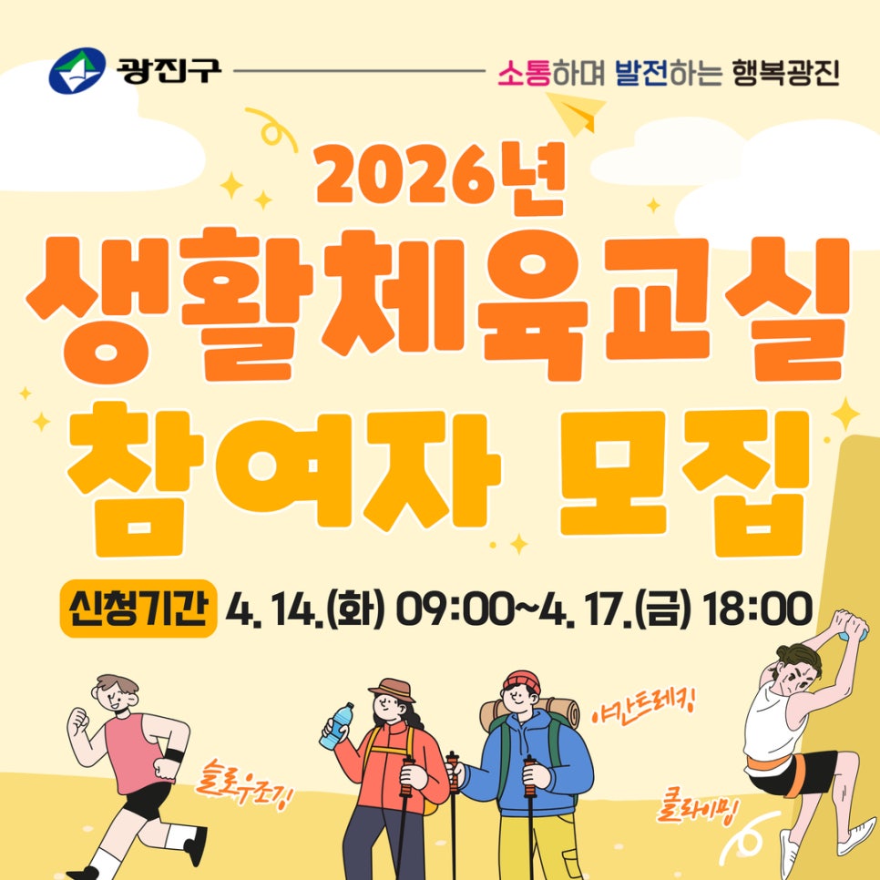 광진구에서는 구민 여러분의 건강 증진과 활기찬 일상생활을 위해 생활체육교실을 운영하고 있습니다. 이번은 중장년층 및 청년층 대상 프로그램으로 슬로우 조깅, 야간 트레킹, 클라이밍 참여자를 모집합니다. 관심 있는 프로그램에 참여하셔서 건강한 일상을 보내시기 바랍니다! 프로그램 안내 종목 내용 슬로우 조깅 (3회차) - 운영: 5. 6.~ 6. 17. (수) 19:00~20:30 - 대상...