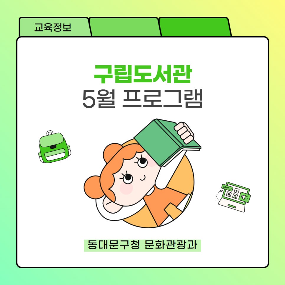 동대문구립도서관 5월 프로그램 디지털 디톡스부터 코딩체험, 북피크닉까지 즐겨보기📚 <동대문구립도서관 5월 프로그램>에서 다~ 해볼 수 있다구요!📗 동대문구립도서관 안내 동대문구정보화도서관 02-960-1959 동대문구답십리도서관 02-982-1959 배봉산숲속도서관 02-2215-1959 동대문책마당도서관 02-2127-4116 휘경행복도서관 02-2249-9701 제기...