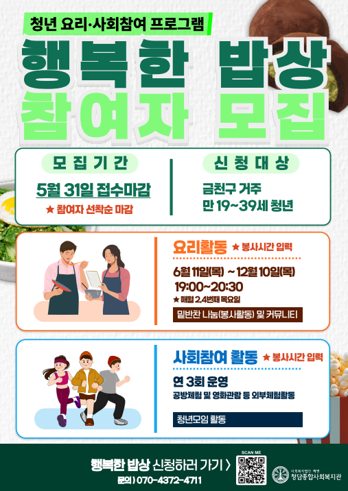 혼자 밥 먹기 외로운 너, 청담종합사회복지관 행복한 밥상에서 함께 밥 먹을 사람 찾아봐.