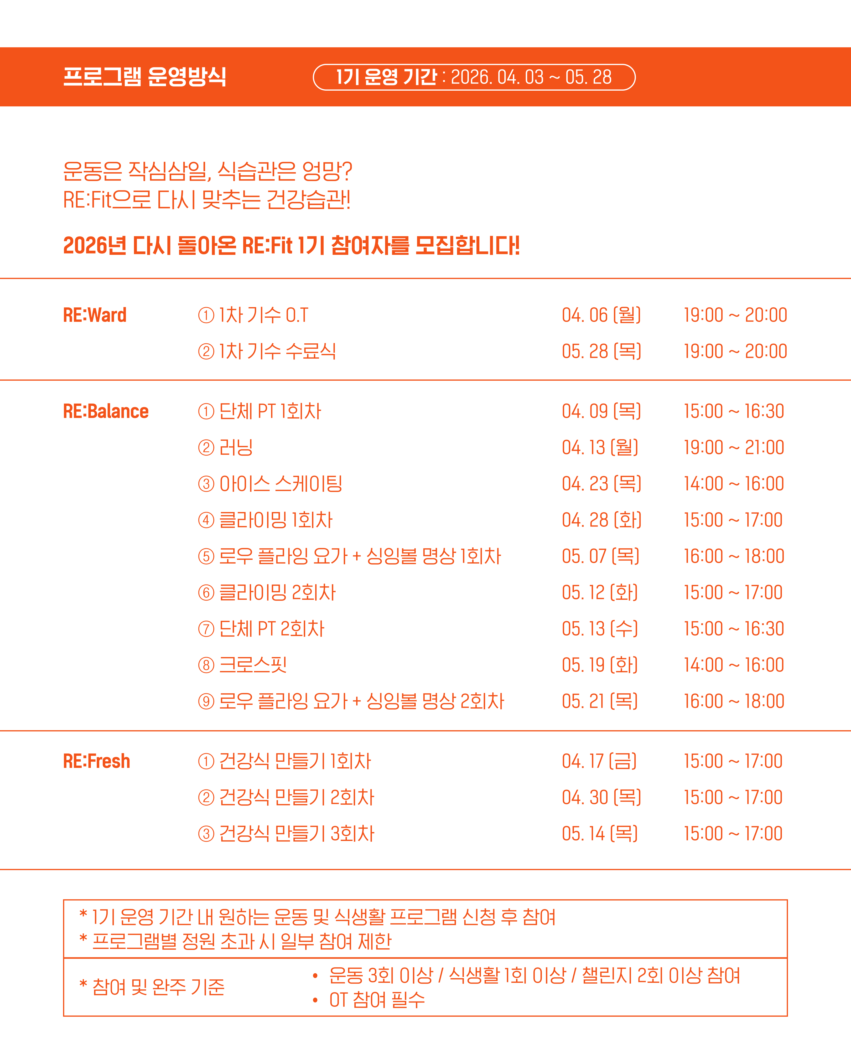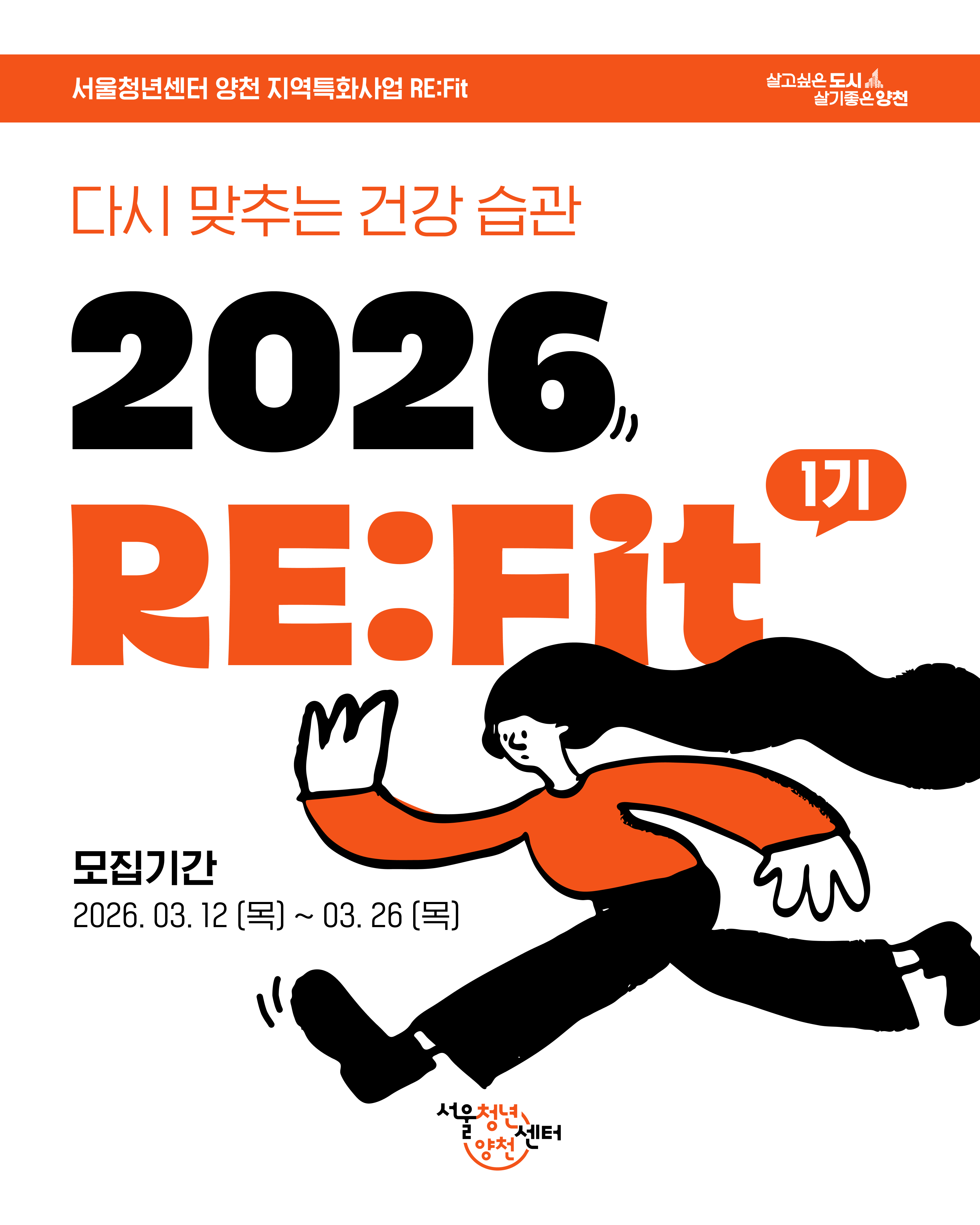 🏃2026 RE:Fit 1기 모집 안내🏃♂️ 운동은 작심삼일, 식습관은 엉망이라면? RE:Fit으로 다시 맞추는 건강 습관! 2026년 다시 돌아온 RE:Fit 1기 참여자를 모집합니다✨ 🧐RE:Fit은 어떤 프로그램인가요? 재밌게 배우는 운동과 요리 프로그램, 함께하는 건강 챌린지까지! 양천구 일대에서 진행되는 다양한 건강 프로그램을 통해 나의 생활습관을 만들어가는 지역특화 청년 건강 형성 프로그램입니다. 📌1기 운영기간 2026. 04. 06 (월) OT ~ 05. 28 (목) 수료식 *OT 및 수료식 필수 참여 📌운영방식 •1기 운영기간 내 원하는 운동 및 식생활 프로그램을 신청해 참여 (*프로그램별 정원 초과 시 일부 참여 제한 가능) •운동 프로그램 3회 이상, 요리 프로그램 1회 이상 참여 필요 •프로그램 상세 일정은 카드뉴스 3P 참고 ◼️모집안내 -모집기간 : 2026. 03. 12 (목) ~ 03. 26 (목) *조기마감 가능 -모집대상 : 양천 생활권 취업준비 청년 or 1인가구 청년 -신청방법 : 하단 구글 폼 RE:Fit 신청서 작성 후 제출 -운영장소 : 서울청년센터 양천 및 양천구 일대 -선정안내 : 03. 27 (금) 선정자 개별 문자 발송 예정 https://forms.gle/ZUVoST6vYeFaf1Py6 ☎️070-4252-8872 서울청년센터 양천