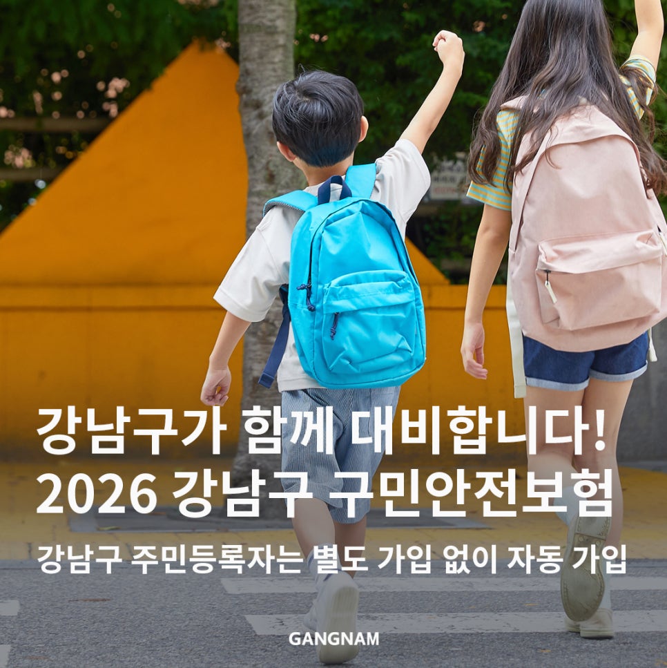 예기치 못한 사고, 강남구가 함께 대비합니다. 강남구에 주민등록이 되어 있다면 별도 가입 없이 자동 가입 완료! ✔(등록 외국인 포함) 일상 속 재난·사고 발생 시 생활안정과 피해보상을 지원해드립니다. ✔ 상해 사망/후유장해 최대 500만원 ✔ 상해 진단 위로금 10 ~ 15만원 ※교통상해 제외 ✔ 대중교통 상해 치료비 100만원 한도 ※택시, 전세버스 제외 ✔ 성폭력범죄/강력범죄 상해...