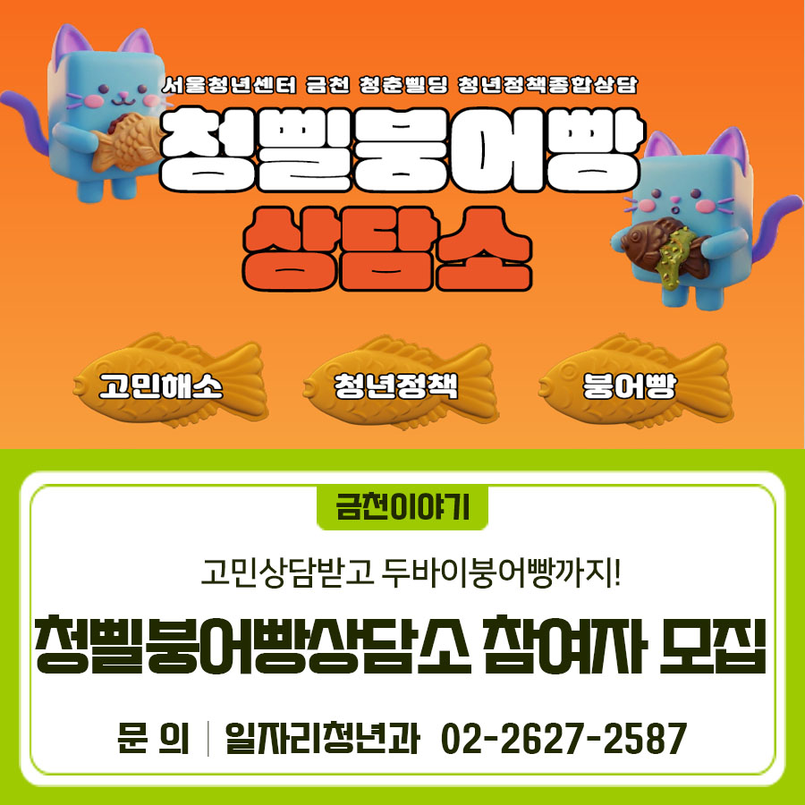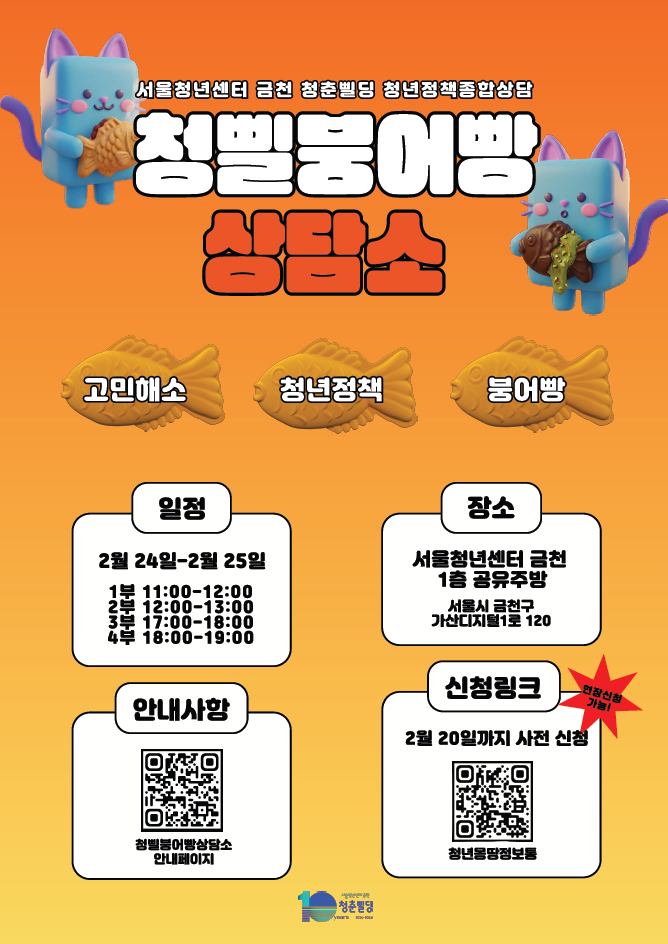 “고민은 털어놓고, 달콤함은 채워가세요!" 청년정책 상담 받고 두바이 붕어빵까지 즐기는 특별한 시간 🐟💛 놓치지 마세요! 진행기간: 2026.2.24일(화) ~ 2.25일 (수) 1부 11:00~12:00, 2부 12:00~13:00, 3부 17:00~18:00, 4부 18:00~19:00 ※ 각 시간대 별 정원 12명 (선착순 마감) ※ 2월 20일 오후 중으로 시간대 조정 예정입니다.