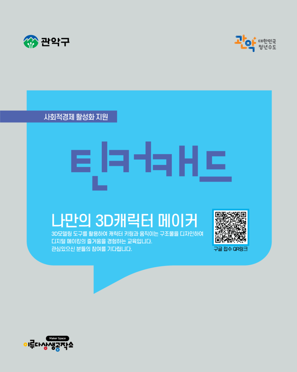 이루다 상생공작소의 '틴커캐드(나만의 3D캐릭터 메이커)' 강의는 3D 모델링 도구를 활용하여 캐릭터 키링과 움직이는 구조물을 디자인해보고 디지털 메이킹의 즐거움을 경험하는 교육입니다. 관심있으신 분들의 참여를 기다립니다! ✅ 교육일시: <1회차> 2026. 4. 23.(목) 10:00~12:00 <2회차> 2026. 4. 30.(목) 10:00~12:00 ✅ 교육장소: 난...