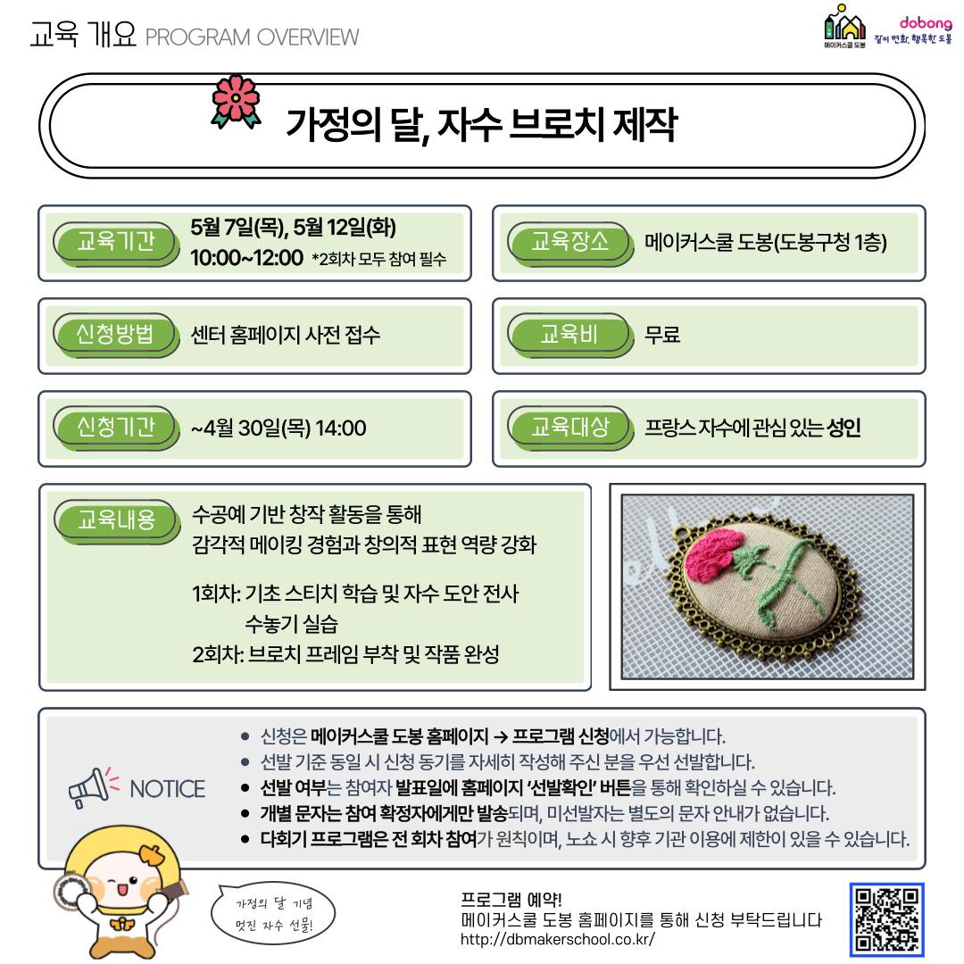 프로그램명: 가정의 달, 자수 브로치 제작 운영기간: 5월 7일(목), 5월 12일(화) 10:00~12:00 *2회차 모두 참여 필수 운영장소: 도봉구청 1층 메이커스쿨 도봉 (서울시 도봉구 마들로656) 주요내용: 프랑스 자수 기법 이해 및 작품 제작 참여방법: 대면 진행 모집일시: ~4월 30일(목) 14:00까지 (이후 선정자에 한해 확정 문자 발송 예정, 4월 30일 이후 선발확인칸 확인 필요) 모집대상: 성인 누구나 참가비: 무료 신청방법: 메이커스쿨 도봉 홈페이지 온라인 신청 http://dbmakerschool.co.kr/ *신청 오류 시 이메일(dobongmakers@naver.com)로 접수 부탁드립니다. (이름, 나이, 연락처, 거주지역, 신청동기 기재) 이메일 접수 또한 선정자에 한해 확정 문자가 발송됩니다.