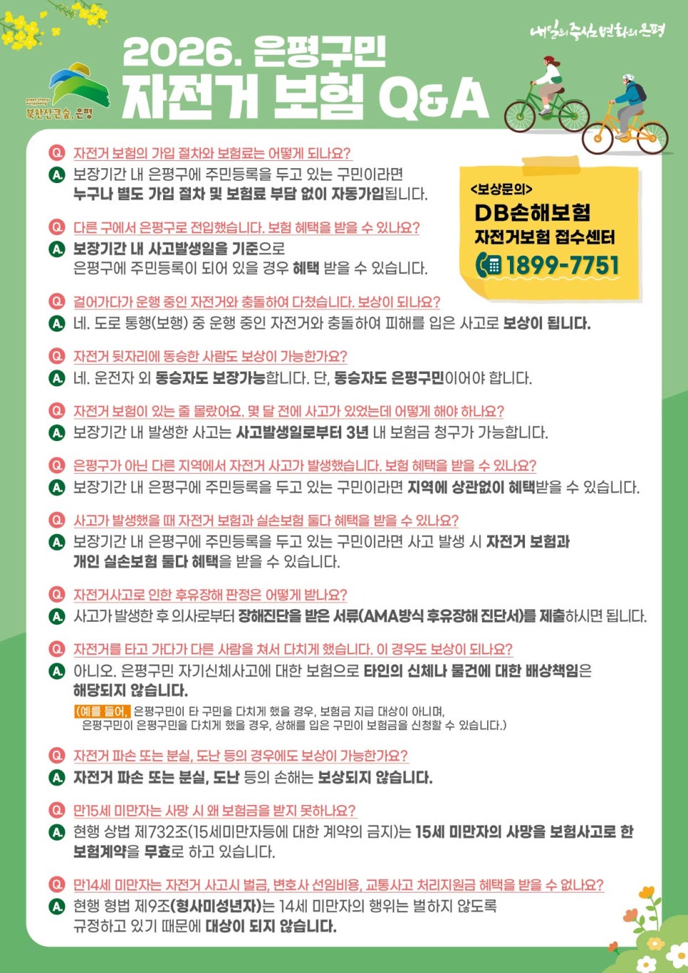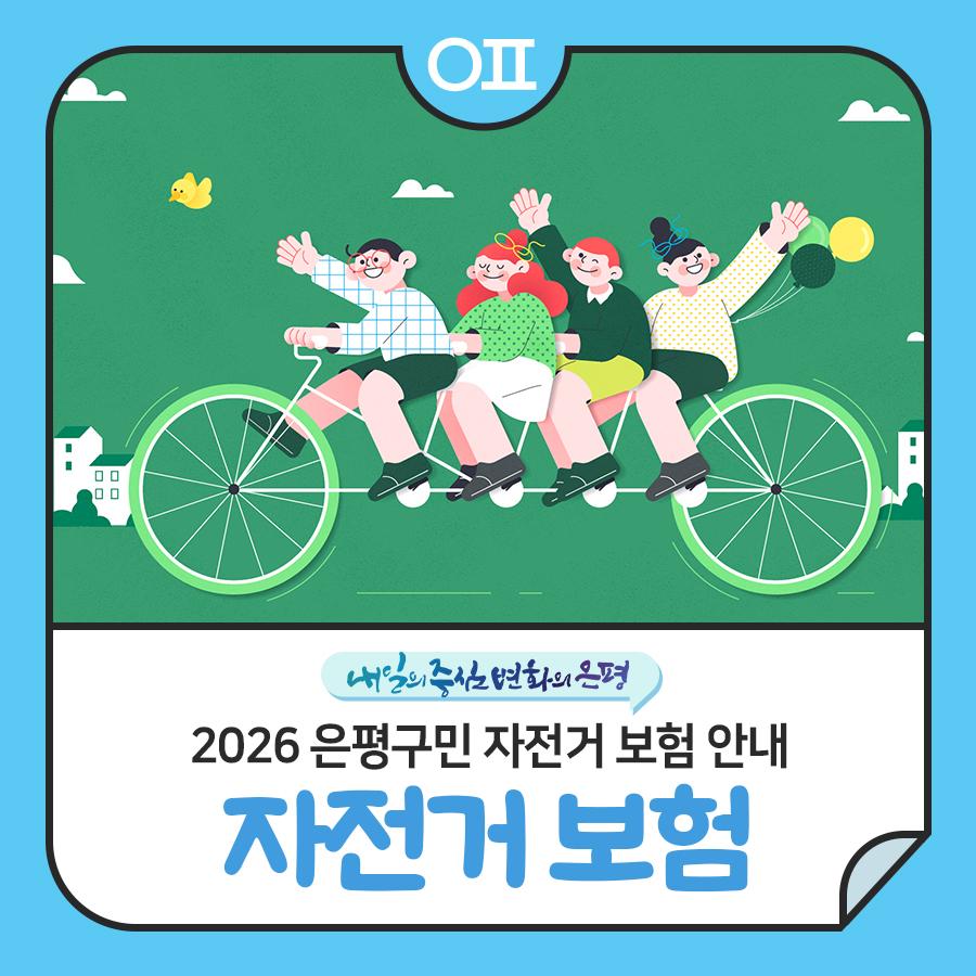 🚲안심하고 자전거 타세요! 은평구민 누구나 자전거 보험 혜택 적용! 은평구민이신가요? 은평구민이시라면 누구나(등록 외국인 포함) 별도 가입절차 및 보험료 부담 없이 자전거 보험 혜택이 적용됩니다. 갑작스러운 자전거 사고에 당황하지 마시고 보장범위, 보장항목 확인하시어 안심하고 자전거 타세요~🚲 ✅보장기간 2026. 3. 1. ~ 2027. 2. 28. ✅피보험자 보장기간 내 ...