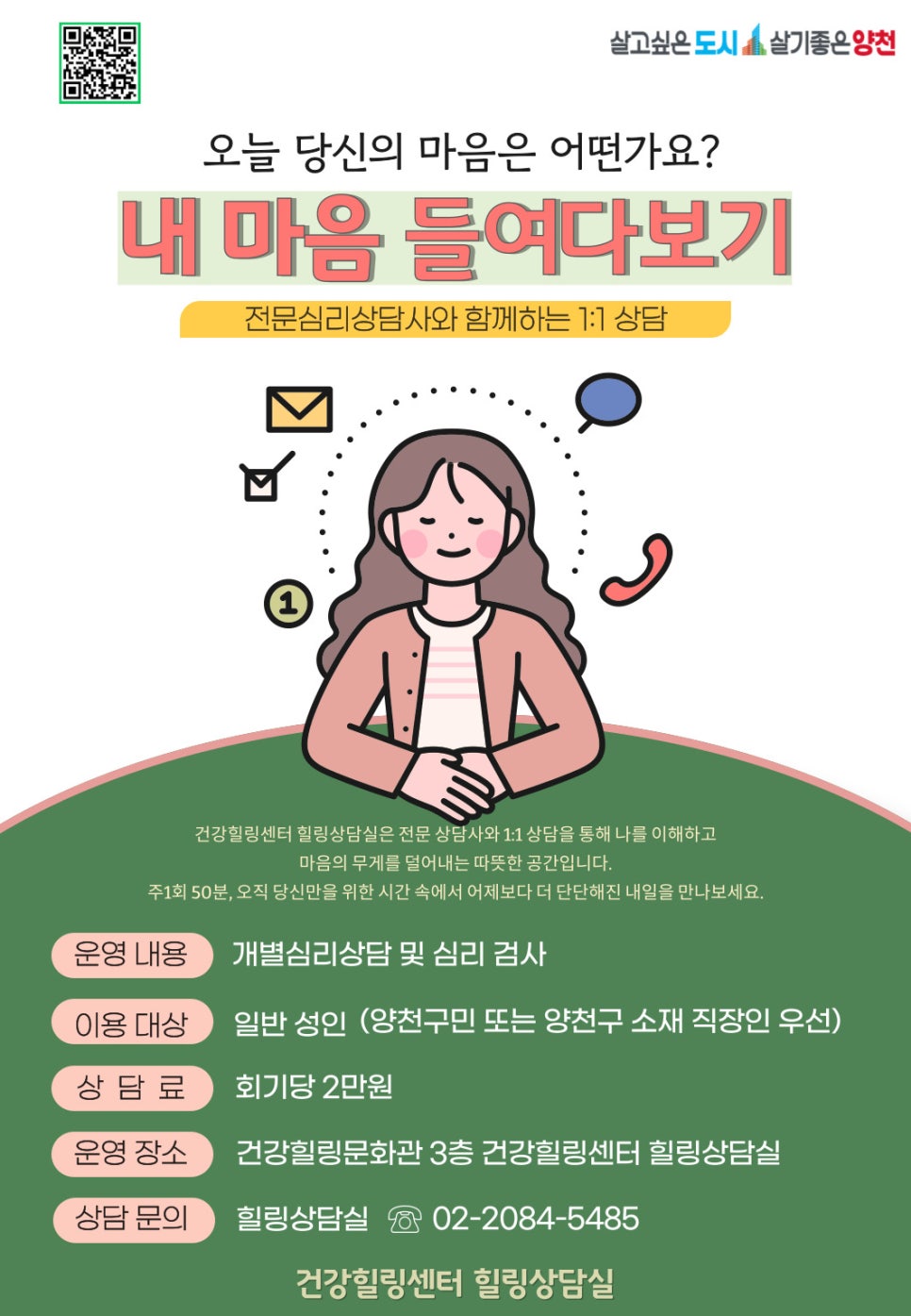 어제보다 더 단단한 내일을 위해 🌱 건강힐링센터 '힐링상담실' 운영 안내 오늘 당신의 마음은 어떤가요? 복잡한 생각들로 마음이 무겁거나, 나를 온전히 이해하고 싶은 순간이 있죠. 양천구 건강힐링문화관에서 당신의 이야기에 귀 기울이고, 마음의 무게를 함께 덜어낼 '힐링상담실'을 운영합니다. 전문 상담사와 함께하는 1:1 상담을 통해 진정한 나를 찾아가는 여정을 시작해 보세요. ✨...