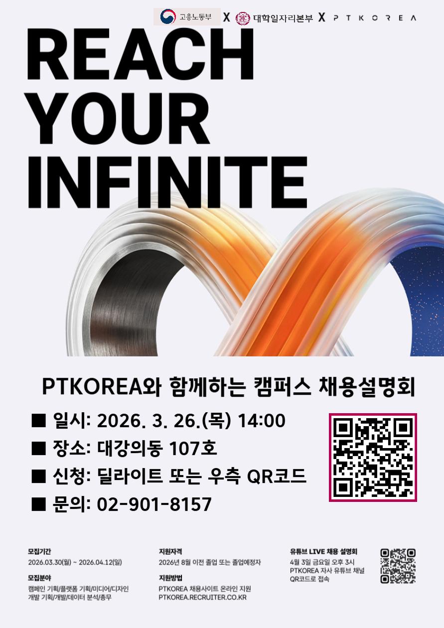 ■사업목적 - 광고 및 홍보 마케팅 업계 취업을 희망하는 청년들의 취업 직무역량 강화를 위한 캠퍼스 채용설명회 개최 ■신청대상 - 재학생, 졸업예정자, 미취업 졸업생 및 지역청년 ■신청기간 - 2026.03.19.(목)~2026.03.25.(수) ■진행내용 - 제일기획 자회사 PT Korea 기업‧브랜드 소개 및 공채 일정 안내 - 채용 자격 및 근무 조건, 직무 소개 등 - 공채 Tip 공유 - 질의 및 응답 ■진행일시 - 2026.03.26.(목) 14:00 ~ 16:00 (총2시간) ■진행장소 - 덕성여자대학교 대강의동 107호 ■신청방법 - 학생종합경력개발시스템 덕성여대 (로그인-> 메인 페이지 -> 프로그램 -> 지역청년 프로그램 -> 신청) ■문의 - 02-901-8157 / jslee@duksung.ac.kr ■홈페이지 https://delight.duksung.ac.kr/ko/program/9/view/2040