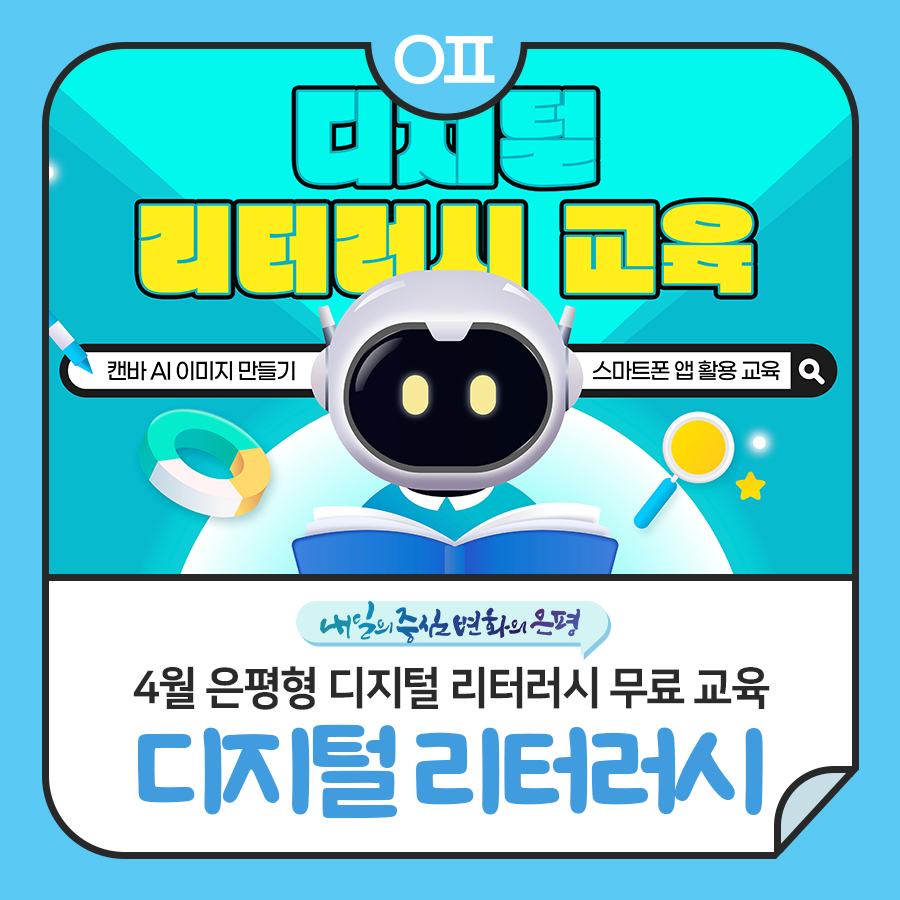 인터넷 기초, 스마트폰 앱 활용 캔바 AI 이미지 만들기까지! 4월 은평형 디지털 리터러시교육과 함께 배워요🙌🏻 🗓️ 4월 교육 시간표 🗓️ 교육장: 응암3동 주민센터 교육기간: 4.2 - 4.28. (화, 목) 시간과정명 난이도 인원 10:00-12:00 인터넷 기초 ★☆☆ 20 13:00-15:00 스마트폰 앱 활용 ★★☆ 20 15:30-17:30 Canva(캔바)로 AI 이미지 만들기(PC) ★★☆ 20