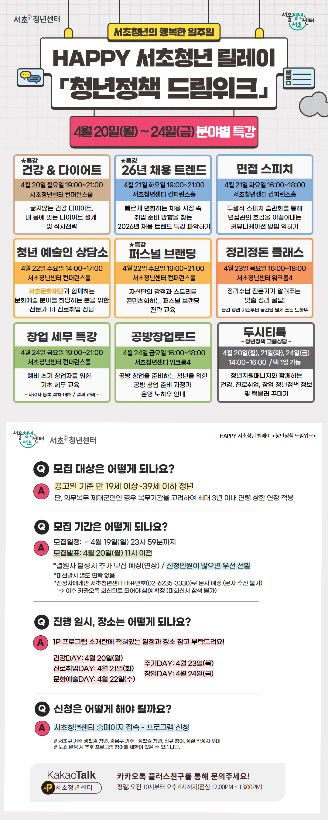 청년들이 필요로 하는 모든 활동 모아보기💌 서초청년센터에서 만나요! 🍀HAPPY 서초청년 릴레이 「청년정책 드림위크」 ✔ 건강, 채용 트렌드, 창업 세무 특강 ✔ 두시티톡(청년정책 그룹상담 & 텀블러 꾸미기 체험) ✔ 면접 스피치 ✔ 생활공간 리셋 : 정리정돈 클래스 ✔퍼스널 브랜딩과 예술인 상담소 운영 ✔공방 창업 준비하는 청년을 위한 노하우 안내 취업 준비 방향성 잡기부터 건강한 삶을 위한 활동들까지✨ 📢 신청 기간: 4월 19일(일) 23시 59분까지 📢 신청 방법: 서초청년센터 홈페이지 📢 선정 발표: 4월 20일(월) 11시 이전 📆 진행 일정과 장소는 포스터 내 참고 부탁드려요! 다양한 프로그램 많으니 꼭 신청하세요👀