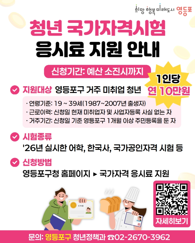 취업을 준비하다 보면 자격증 시험 준비에 드는 비용도 만만치 않은데요🥲 시험 접수비부터 교재, 준비 과정까지 생각보다 부담이 되는 경우가 많습니다. 이런 청년들의 부담을 덜어주기 위해 영등포구에서 청년 국가자격시험 응시료 지원 사업을 운영하고 있습니다! 국가자격시험에 도전하는 청년이라면 1인당 최대 10만원까지 응시료 지원을 받을 수 있는 제도이니 관심 있으신 분들은 꼭 확...