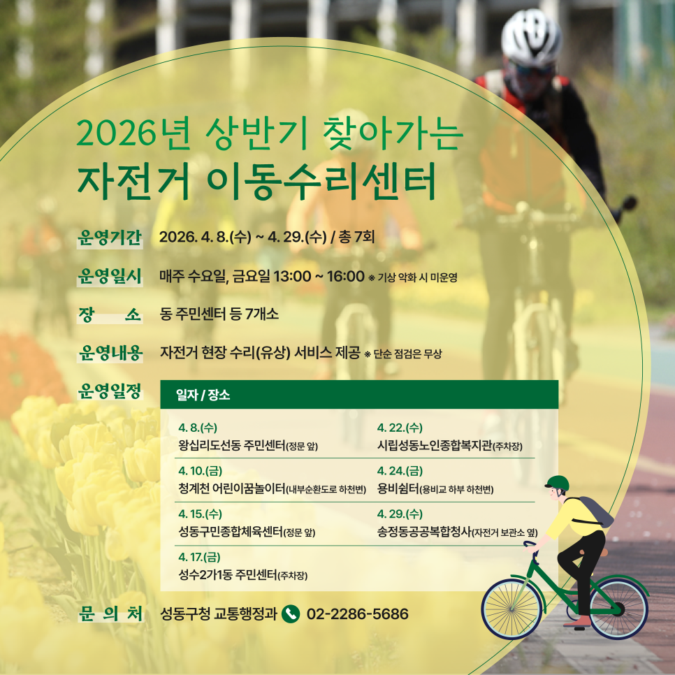 움츠렸던 계절을 지나기 기분 좋게 몸을 깨워 볼 시간입니다. 겨우내 잠들어 있던 자전거 🚲 브레이크는 괜찮은지, 바퀴 바람은 충분한지 전문가의 손길로 안전하게 점검해 보세요. 2026년 상반기 찾아가는 자전거 이동수리센터 2026. 4. 8. ~ 4. 29. 가까운 곳에서 간편하게 점검받고, 올봄은 더 가볍고 안전하게 달려보세요 🚴♀️✨ 🗓️ 운영기간 2026. 4. 8. (...