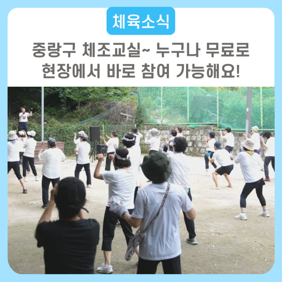 [체육소식] 중랑구 체조교실~ 누구나 무료로 현장에서 바로 참여 가능해요! 문의 : 중랑구청 체육진흥과(☎ 02-2094-0073) 2026년 3월부터 11월까지 중랑구 곳곳에서 에어로빅 체조교실 및 국학기공 체조교실을 운영합니다. 중랑구 체조교실 13개 모두 남녀노소 가리지 않고 별도 신청절차 없이 누구나 현장에서 무료로 바로 참여하실 수 있습니다. 따뜻해지는 봄날~ 체조...