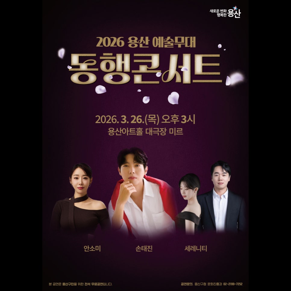 🎤 지친 일상에 위로와 즐거움을! 2026 용산예술무대 「동행콘서트」 무료 개최 🎶 ▪️ 일시: 2026. 3. 26.(목) 오후 3시 ▪️ 장소: 용산아트홀 대극장 미르 ▪️ 출연진 - 손태진 (성악가 겸 '불타는 트롯맨' 초대 우승자) - 안소미 (KBS 공채 개그우먼, '미스트롯' 출연) - 세레니티 (크로스오버 듀오) ▪️ 관람료: 무료 (※ 현장 선착순 티켓 배포)