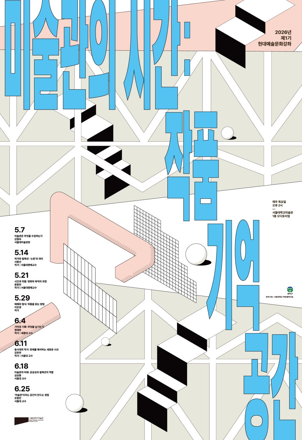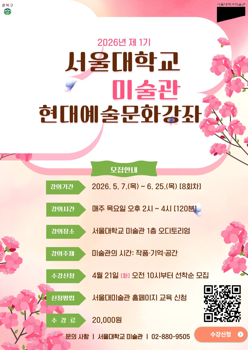 서울대학교 미술관에서는 현대예술문화강좌를 「미술관의 시간: 작품ㆍ기억ㆍ공간」이라는 주제로 준비했습니다. 매주 목요일 오후, 미술관 오디토리엄에서 국내외 다양한 교수와 작가들이 작품과 기억, 공간의 관계를 주제로 미술관을 새롭게 바라보는 시간을 제공합니다. ✅ 강의기간: 2026. 5. 7.(목)~6. 25.(목) ✅ 강의시간: 매주 목 14:00~16:00 (120분) ✅...