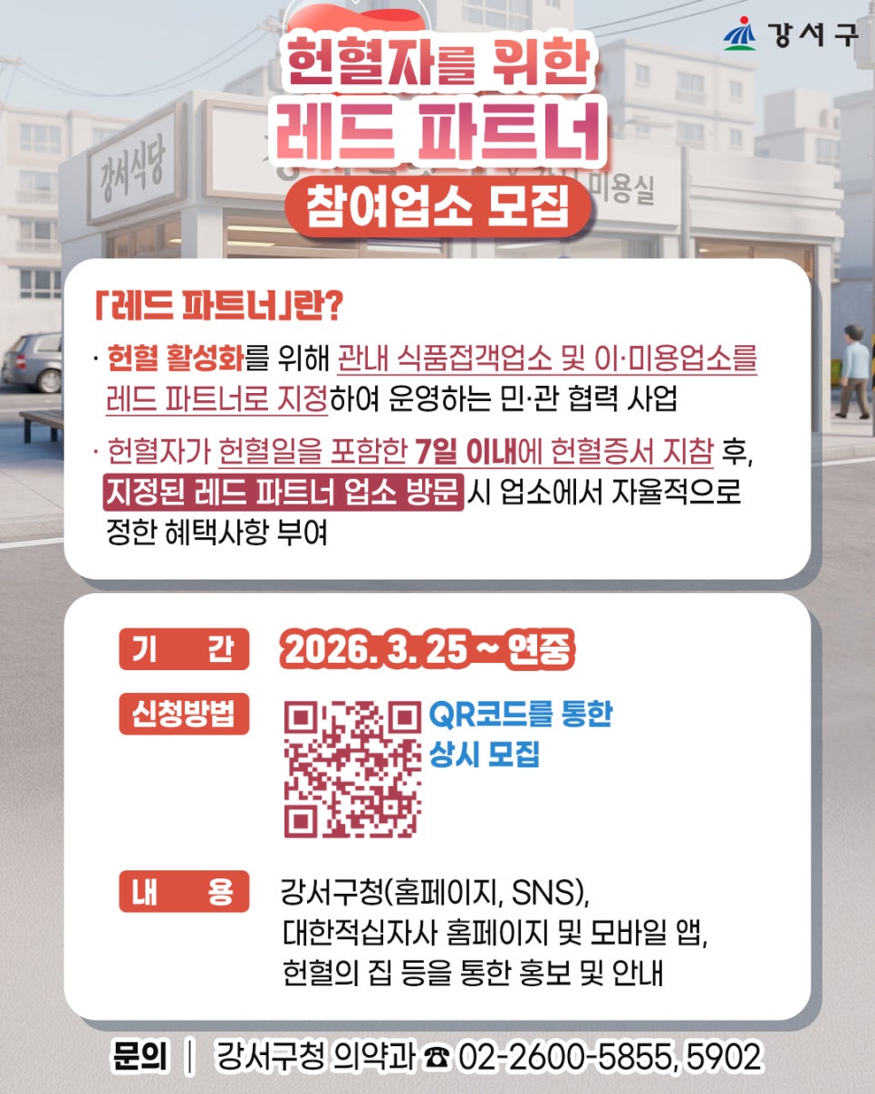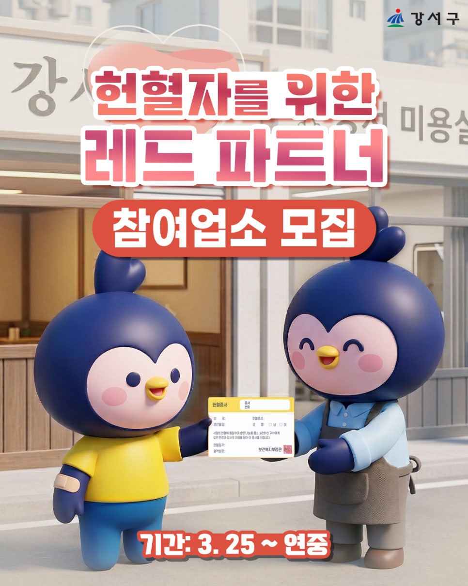 혹시 헌혈하고 나서 “좋은 일 했는데, 뭔가 더 있었으면 좋겠다…” 이런 생각 해보신 적 있으신가요? 😊 강서구에서는 헌혈자분들을 위한 작지만 확실한 혜택을 준비했습니다! 🩸 레드파트너란? 헌혈 활성화를 위해 관내 음식점·카페·미용실 등을 ‘레드파트너 업소’로 지정해 운영하는 민·관 협력 사업입니다. ✔ 헌혈 후 7일 이내 ✔ 헌혈증 + 신분증 지참 ✔ 레드파트너 업소...
