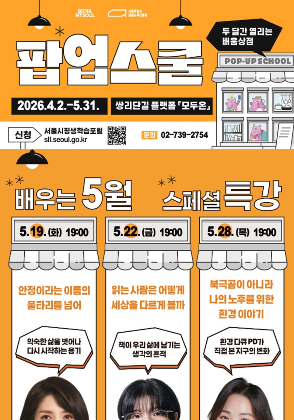 서울 평생학습 팝업스쿨 5월 명사특강 및 프로그램 신청 안내 서울 평생학습 팝업스쿨 5월 특강 및 프로그램 신청 안내 서울시 최초로 도봉구에서 시범 운영하는 서울 평생학습 팝업스쿨 5월 특강 및 프로그램에 많은 신청 바랍니다. 운영기간: 2026.4.2.(목)~5.31.(일) 교육장소: 쌍리단길 플랫폼, 모두온(도봉구 도봉로112길43, 3층) 신청기간:...