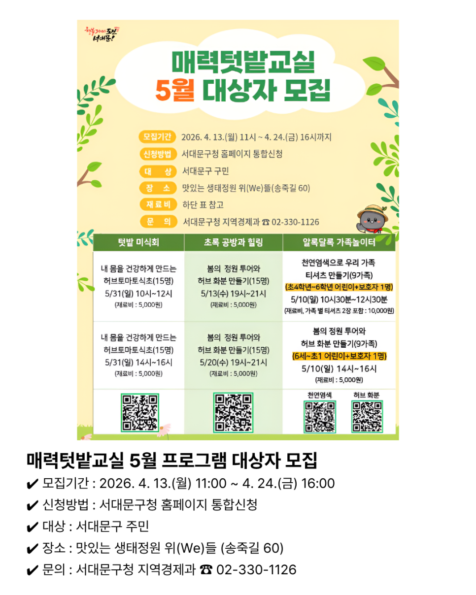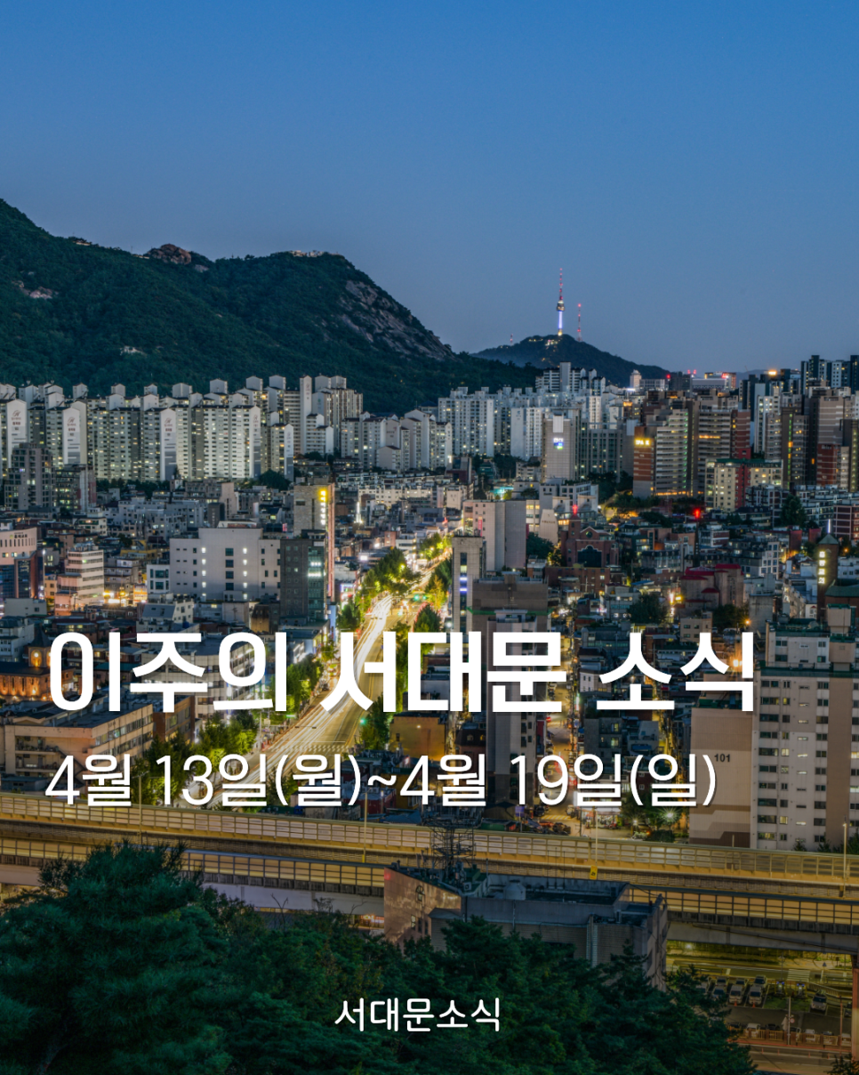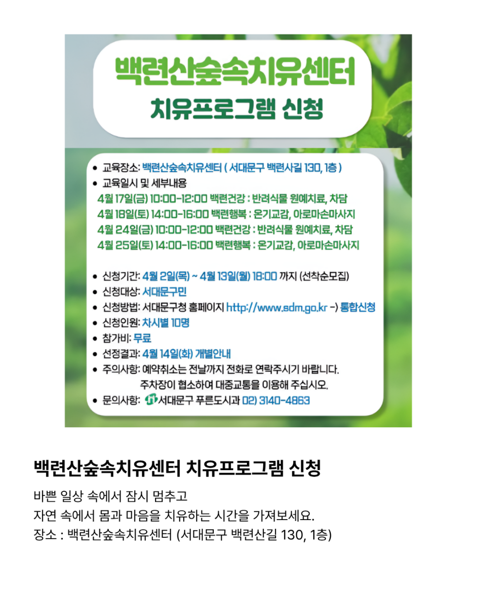 💟이주의 서대문 소식💟 4월 13일(월)~4월 19일(일) 서대문구에서 진행되는 이번 주 주요 소식과 참여 프로그램을 소개합니다. 주민 여러분께 도움이 되는 다양한 모집·교육·지원사업 정보를 확인해 보세요! 🌿 백련산 숲속치유센터 치유프로그램 📍 장소 백련산숲속치유센터(서대문구 백련산길 130, 1층) 📅 운영 일정 ✔ 4월 17일(금) 10:00 ~ 12:00 백련건강 ...