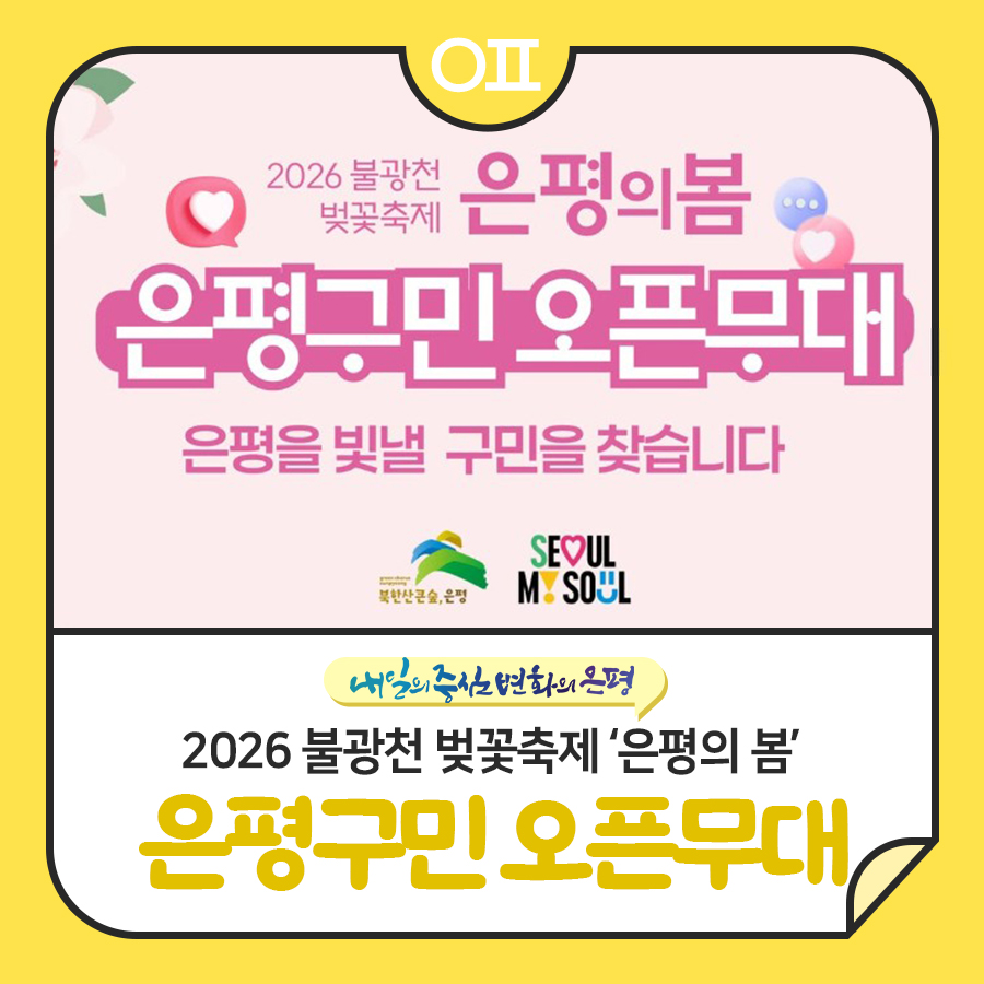 2026 불광천 벚꽃축제 <은평의 봄> 은평구민 오픈무대 많관부!!🌸🌸 은평을 빛낼 구민을 찾아요🌸 노래, 춤, 연주, 퍼포먼스 등 여러분의 끼와 재능을 마음껏 뽐낼 무대입니다. 2026년 불광천 벚꽃축제는 4월 3일(금) - 4월 4일(토) 양일간 진행해요-!!🌸 끼 있는 은평구민 여기 여기 모여라!! 노래도 좋고, 춤도 좋고, 연주와 퍼포먼스도 모두 환영합니다🙌🏻 올봄...