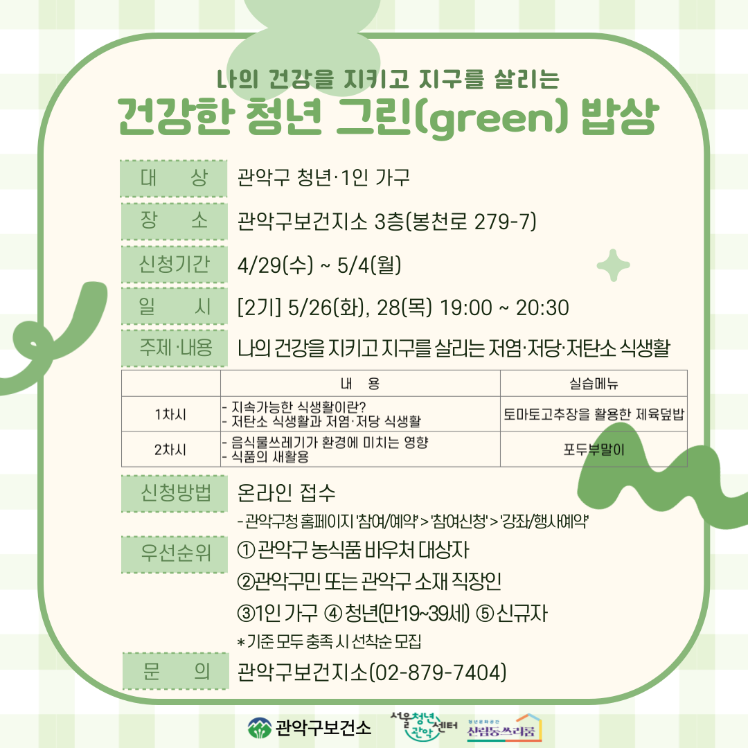 1인 가구 청년 「2026 건강한 청년 그린(green) 밥상」 1-2기 운영 ◉ 개요: 1인 가구 청년을 대상으로 균형 있는 식생활과 환경을 고려한 저탄소 식생활 실천을 위한 영양교육을 진행하고, 레시피 제공 및 조리 실습을 통한 지속가능한 건강 식생활 실천을 유도 ◉ 대 상 : 관악구민 청년 1인 가구(기수 당 20명 모집) ◉ 장 소 : 관악구보건지소 3층 교육실 ◉ 신청기간 : 4/29(수) ~ 5/4(월) ※ 모집상황에 따라 조기마감 될 수 있음 ※ 최종선정 결과는 5/6(수) 이후 문자로 개별 안내 예정 ◉ 일 시 [1기] 5/19(화), 21(목) 19:00~20:30 [2기] 5/26(화), 28(목) 19:00~20:30 ※ 본 프로그램은 1기수당 2차시로 구성되며, 신청자는 해당 기수의 교육(2회)에 모두 참여하여야 합니다. ◉ 주 제 : 나의 건강을 지키고 지구를 살리는 저염・저당・저탄소 식생활 ◉ 세부내용 [1차시] 지속가능한 건강 식생활과 저탄소 식생활의 실천 - 실습 메뉴: 저염저당 토마토고추장을 활용한 제육덮밥 [2차시] 음식물쓰레기의 발생을 줄이는 음식의 새활용 - 실습 메뉴: 포두부말이 ※ 교육 내용 및 조리 실습은 교육상황(재료 수급 등)에 따라 변경 및 수정될 수 있습니다. ◉ 신청방법 : 관악구청 홈페이지 ‘참여/예약’ → ‘참여신청’ → ‘강좌/행사예약’에서 온라인 접수 https://www.gwanak.go.kr/site/gwanak/ex/reservation/re00401.do?riType=E ◉ 우선순위 : ① 관악구 농식품 바우처 대상자 ② 관악구민 또는 관악구 소재 직장인 ③ 1인 가구 ④ 청년(만 19~39세) ⑤ 신규자 ※ 기준을 모두 충족하며 동일 조건 시 선착순으로 모집 ◉ 문 의 : 관악구보건지소(☎ 02-879-7404, 7413)